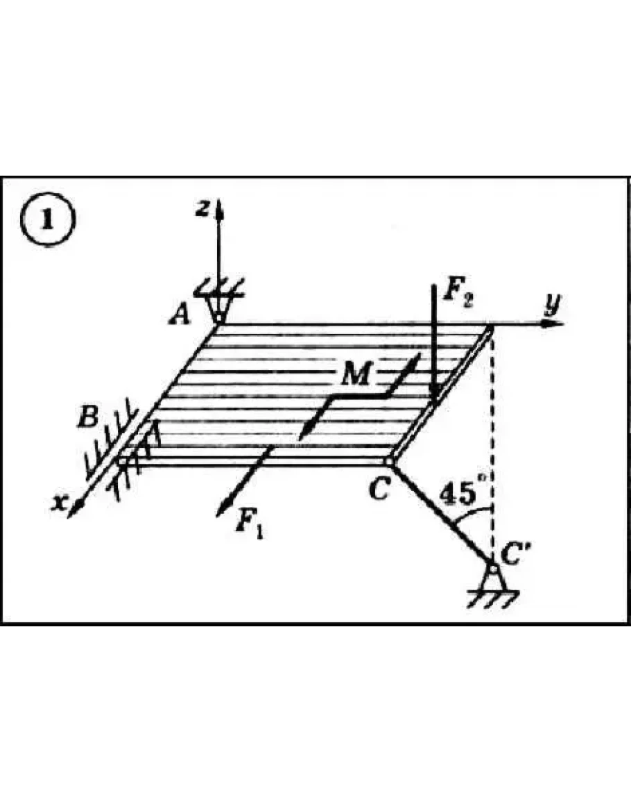 Для представленного на схеме тела определить реакции опор. Тело предствляет собой однородную прямоугольную плиту весом G = 12 кН, имеющую размеры |AB| = 6м и |BC| = 2м. Плита закреплена с помощью трех опор: шарнирно-неподвижной опоры (сферический шарнир) в точке А, подшипниковой опоры в точке В и опорного стержня в точке С. На плиту действует: пара сил с моментом М = 10 кНм, и в серединах соответствующих сторон - горизонтальная сила F1 = 6 кН и вертикальная сила F2 = 8 кН.
