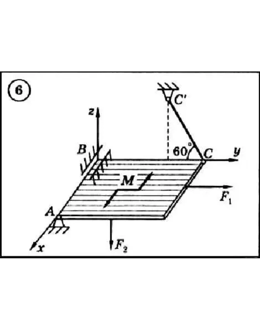 Для представленного на схеме тела определить реакции опор. Тело предствляет собой однородную прямоугольную плиту весом G = 12 кН, имеющую размеры |AB| = 6м и |BC| = 2м. Плита закреплена с помощью трех опор: шарнирно-неподвижной опоры (сферический шарнир) в точке А, подшипниковой опоры в точке В и опорного стержня в точке С. На плиту действует: пара сил с моментом М = 10 кНм, и в серединах соответствующих сторон - горизонтальная сила F1 = 6 кН и вертикальная сила F2 = 8 кН.