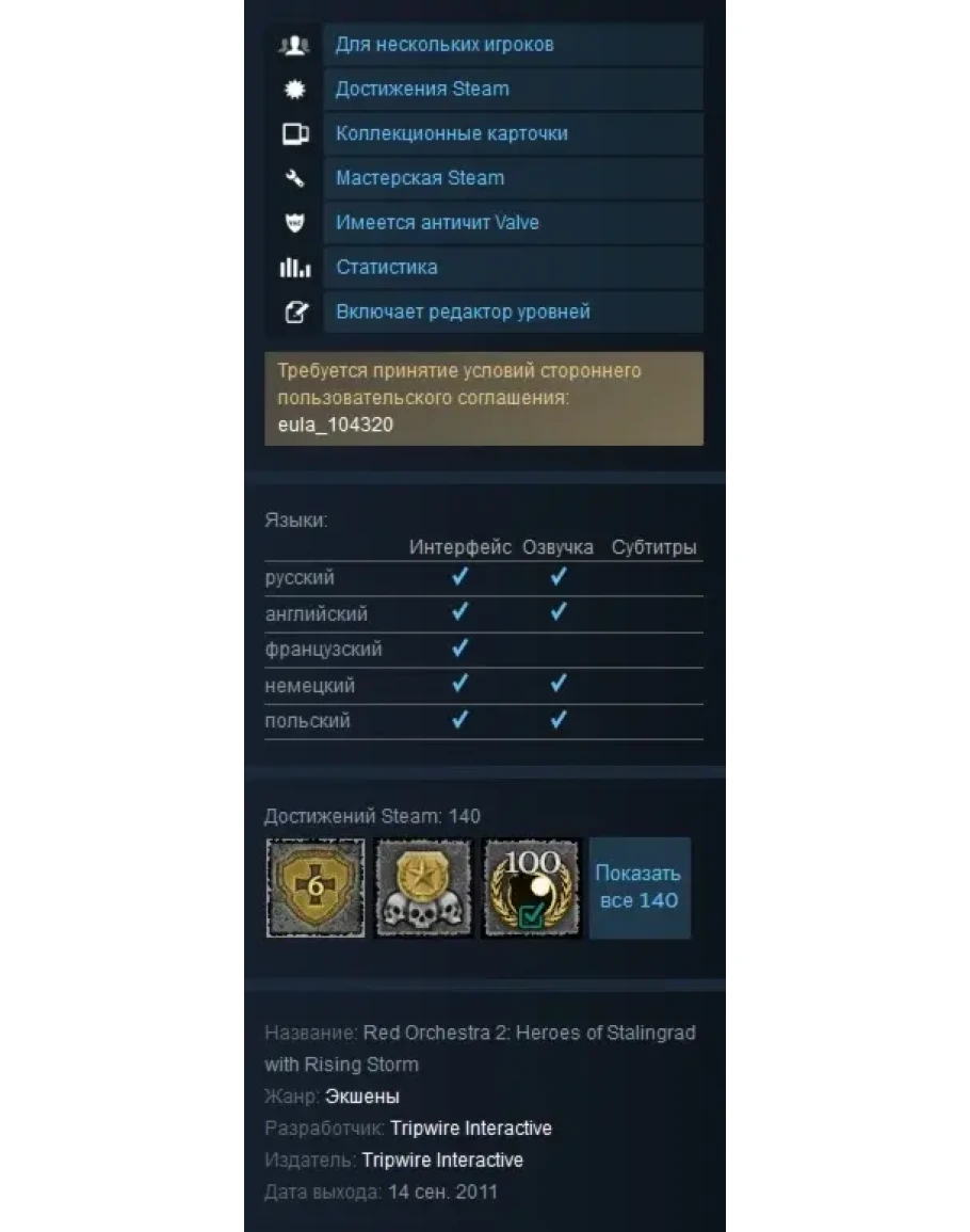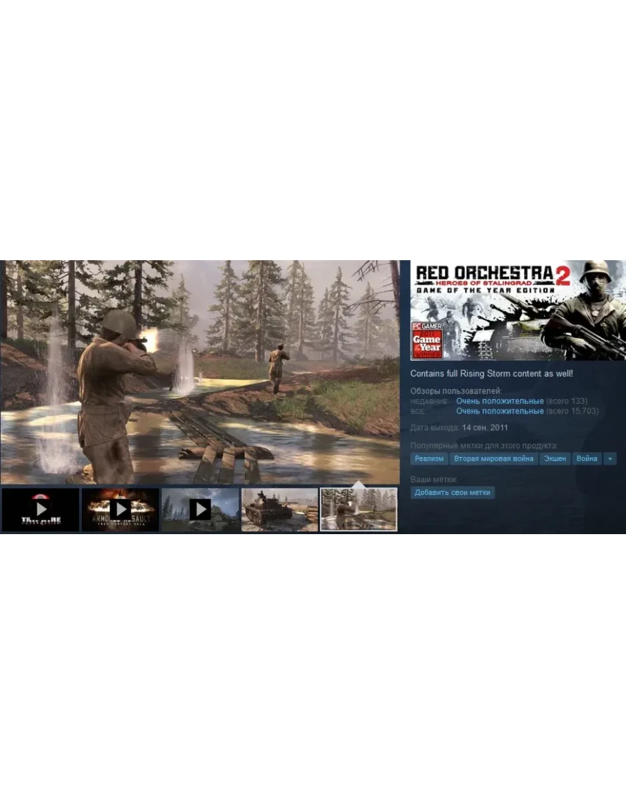 Red Orchestra 2: Heroes of Stalingrad — ведущий тактический многопользовательский шутер про Вторую мировую войну на ПК, который переносит знаменитую серию Red Orchestra в ряд нового поколения игр. Потрясающая графика и звук вместе с движком Unreal Engine 3, а также новые возможности и выдержанный реализм создают потрясающий тактический шутер, которому нет равных.