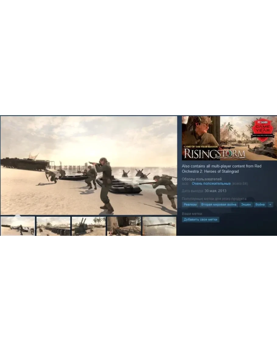 "Rising Storm - следующая игра в удостоенной наград Red Orchestra франшизы. Вы знаете, что отличный игровой процесс, инновационные функции и реалистичный звук и графика RO2 - Rising Storm перенесут это в Pacific Theater, добавив еще больше возможностей, новых уровней, нового оружия и новых фракций. Игра позволит игроку сразиться между культовыми местами от знаменитых кампаний по прыжкам с островов в Тихом океане с 1942 по 1945 год, так как армия США и морской пехотинец сражаются с Имперской японской армией и Специальными военно-морскими высадками. Игроки будут испытывать нападения на берег, сражения в джунглях, ночные бои в ближнем бою и многое другое через Гуадалканал, Иводзиму и Сайпан, среди других культовых сражений. Игрок может принять участие в любой из сторон - американец или японский - сражаясь с ним онлайн в многопользовательском режиме на серверах с 64-игровыми серверами.