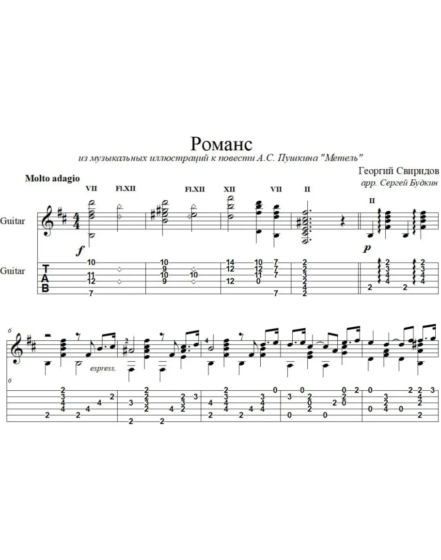 Аранжировка для гитары соло Романса Георгия Свиридова из музыкальных иллюстраций к повести А.С. Пушкина "Метель".