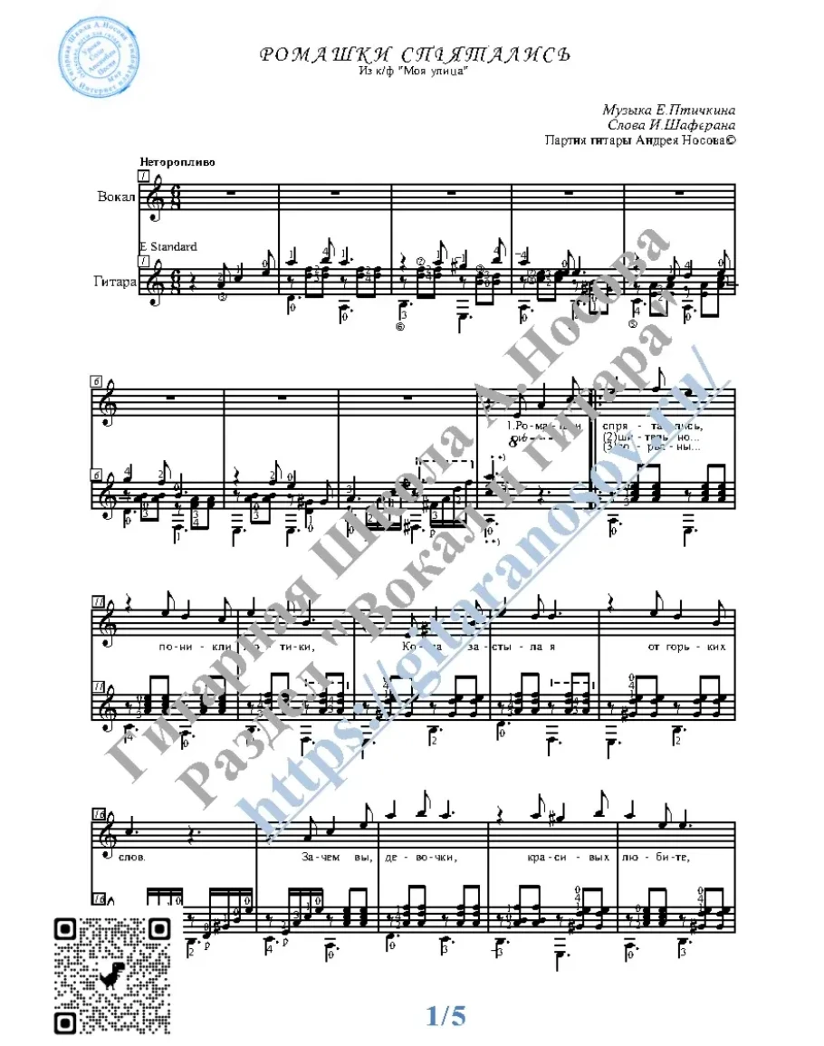 Кликните "Подробнее" для получения дополнительной информацииВашему вниманию предлагается композиция "Ромашки спрятались (муз.Е.Птичкина, сл.И.Шаферана)", предназначенная для вокала в сопровождении 6-ти струнной гитары. Запись выполнена нотами и включает в себя партию вокала с подтекстовкой, партию гитары с подробнейшей аппликатурой и текст песни (НА РУССКОМ).
