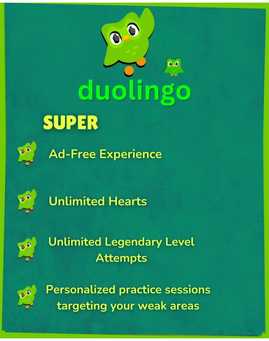 Повысь эффективность изучения языков с Duolingo Super, который активируется безопасно через приглашение в семейный план, отправленное прямо на вашу почту. Наслаждайтесь обучением без рекламы, с неограниченной практикой, персонализированными упражнениями и полным отслеживанием прогресса.