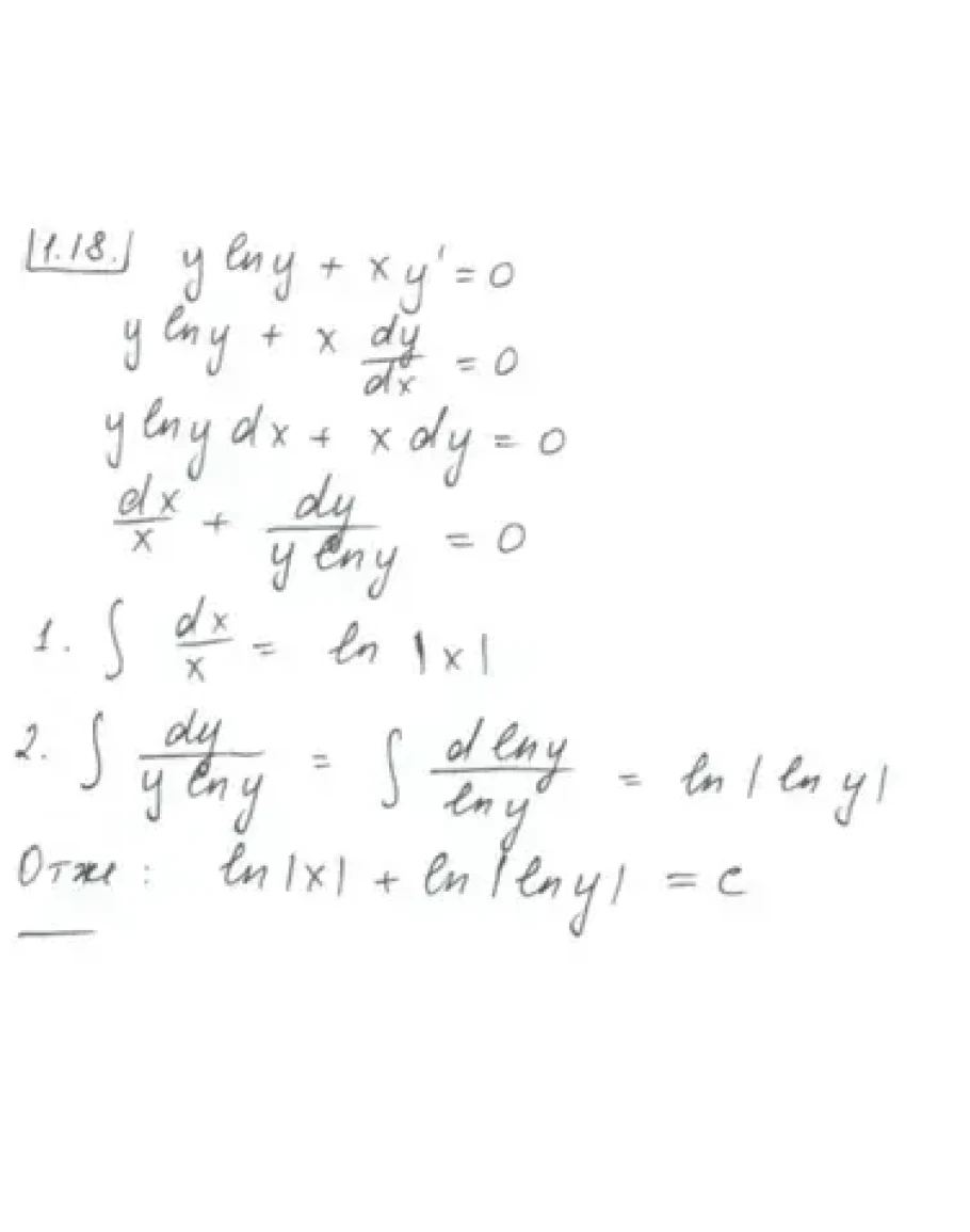 Розв'язана розрахункова робота з диференціальних рівнянь. НУЛП. В першому завданні потрібно знайти загальний інтеграл рівняння, в 15 - розв'язати задачу Коші. Варіант 18.