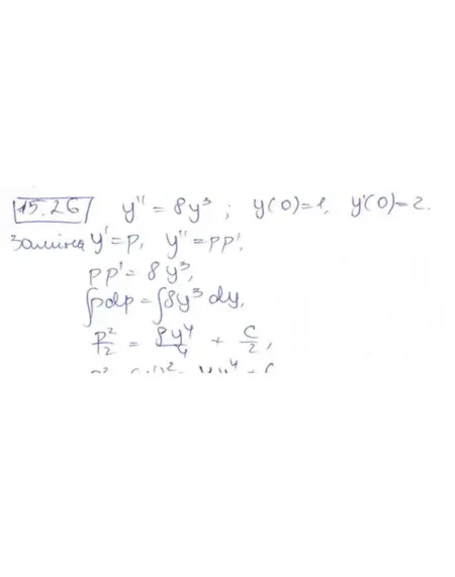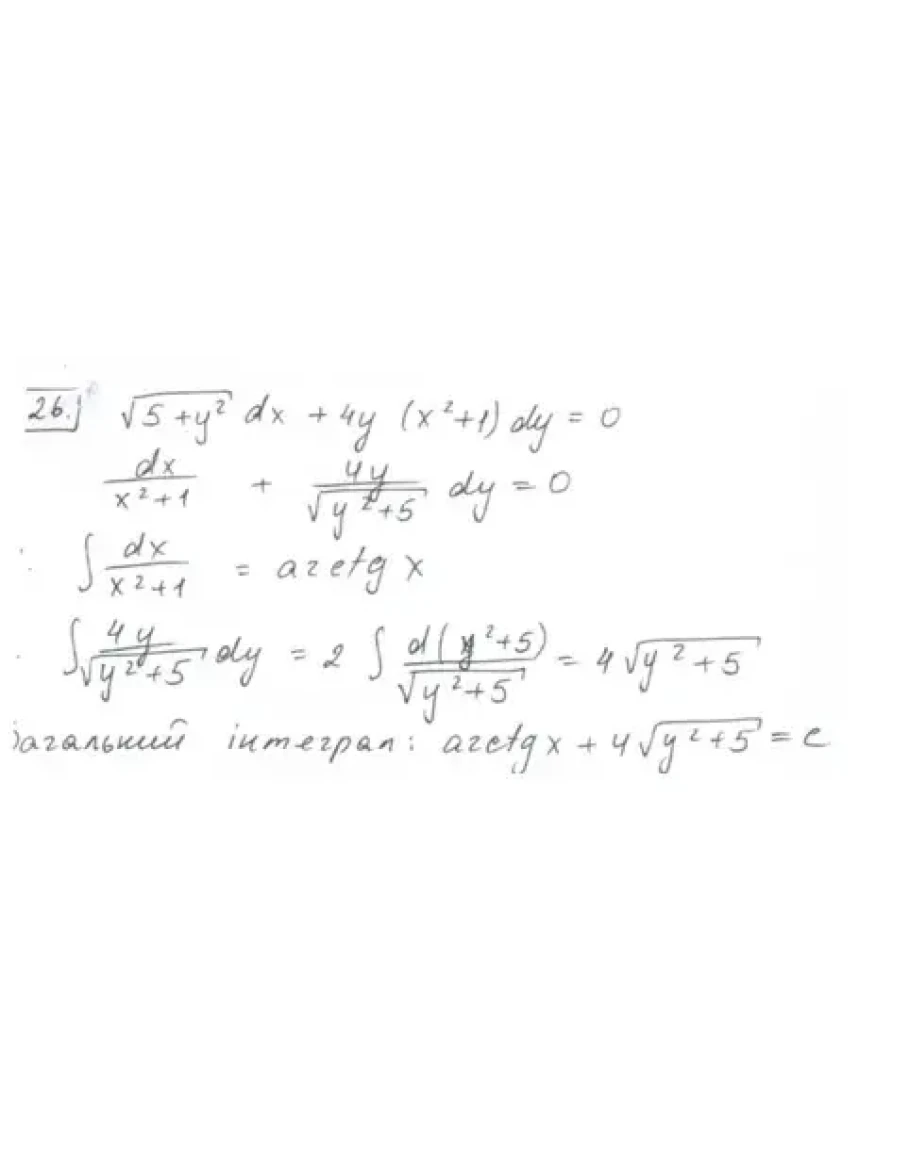 Розв'язана розрахункова робота з диференціальних рівнянь. НУЛП. В першому завданні потрібно знайти загальний інтеграл рівняння, в 15 - розв'язати задачу Коші. Варіант 26.