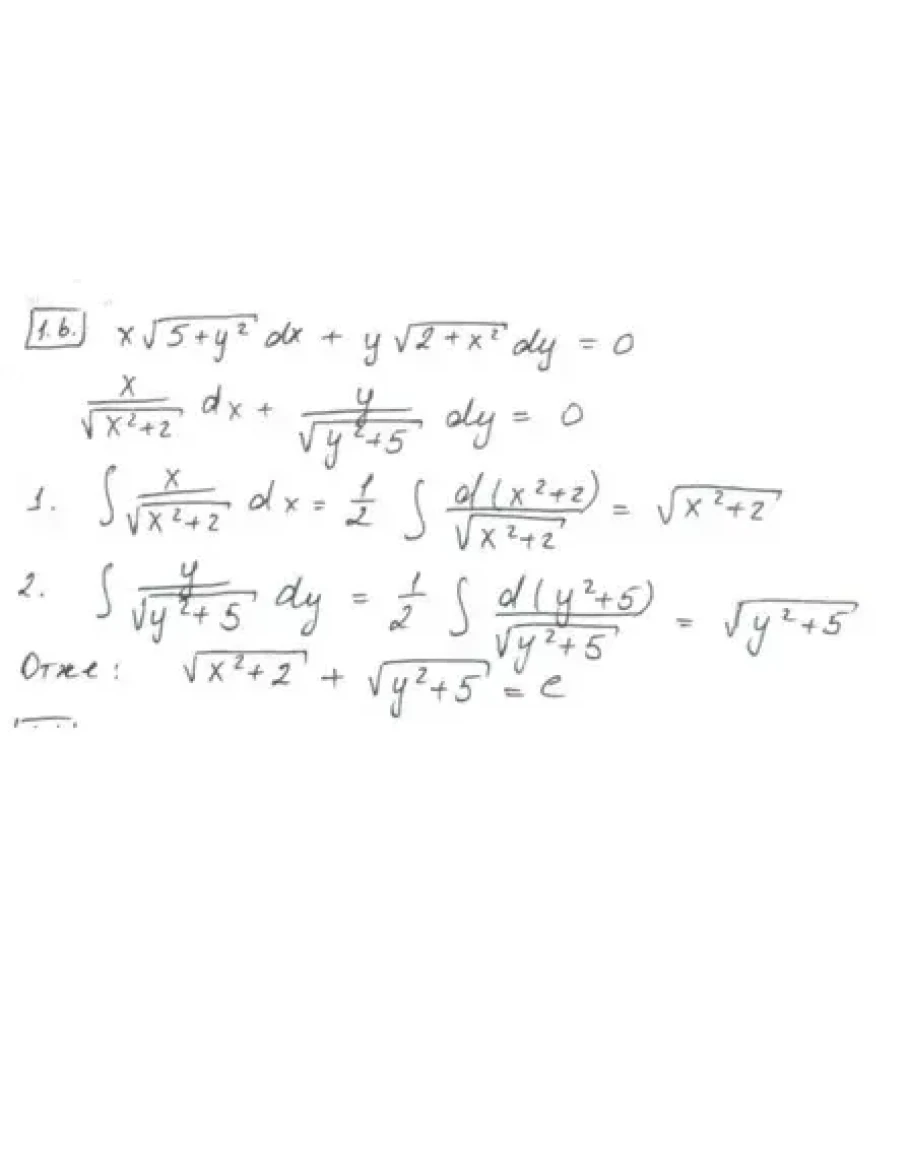 Розв'язана розрахункова робота з диференціальних рівнянь. НУЛП. В першому завданні потрібно знайти загальний інтеграл рівняння, в 15 - розв'язати задачу Коші. Варіант 6.