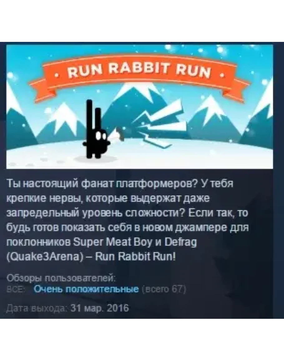 Ты настоящий фанат платформеров? У тебя крепкие нервы, которые выдержат даже запредельный уровень сложности? Если так, то будь готов показать себя в новом джампере для поклонников Super Meat Boy и Defrag (Quake3Arena) – Run Rabbit Run!