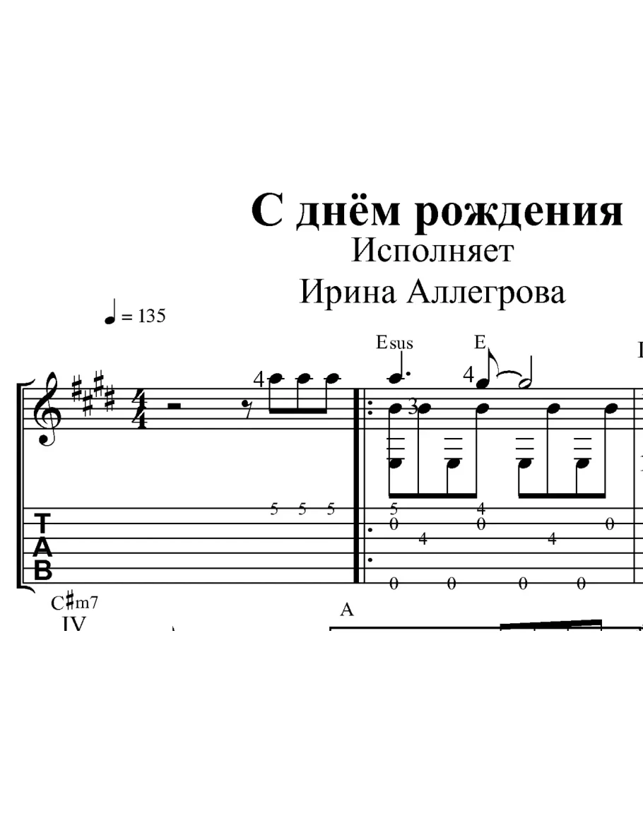 Ноты для гитары с аппликатурой для левой руки и табы к переложению песни И. Аллегровой "С днём рождения"