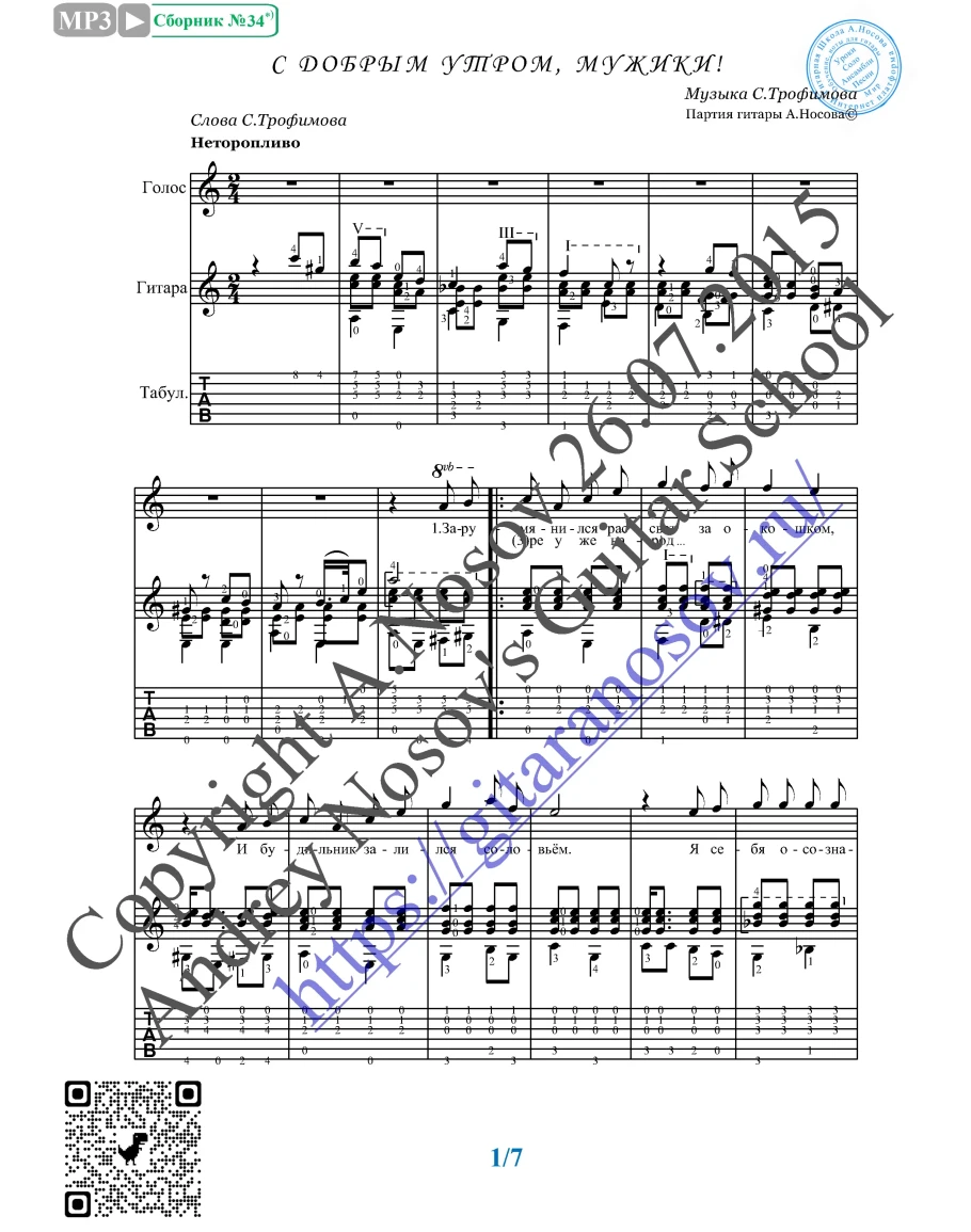 Кликните "Подробнее" для получения дополнительной информацииВашему вниманию предлагается композиция "С добрым утром, мужики (С.Трофимов)", предназначенная для вокала в сопровождении 6-ти струнной гитары (pdf / png*). Запись выполнена нотами и включает в себя партию вокала с подтекстовкой, партию гитары с подробнейшей аппликатурой, текст песни (НА РУССКОМ ЯЗЫКЕ). Партия гитары продублирована табулатурой. Прилагается ссылка на скачивание mp3.