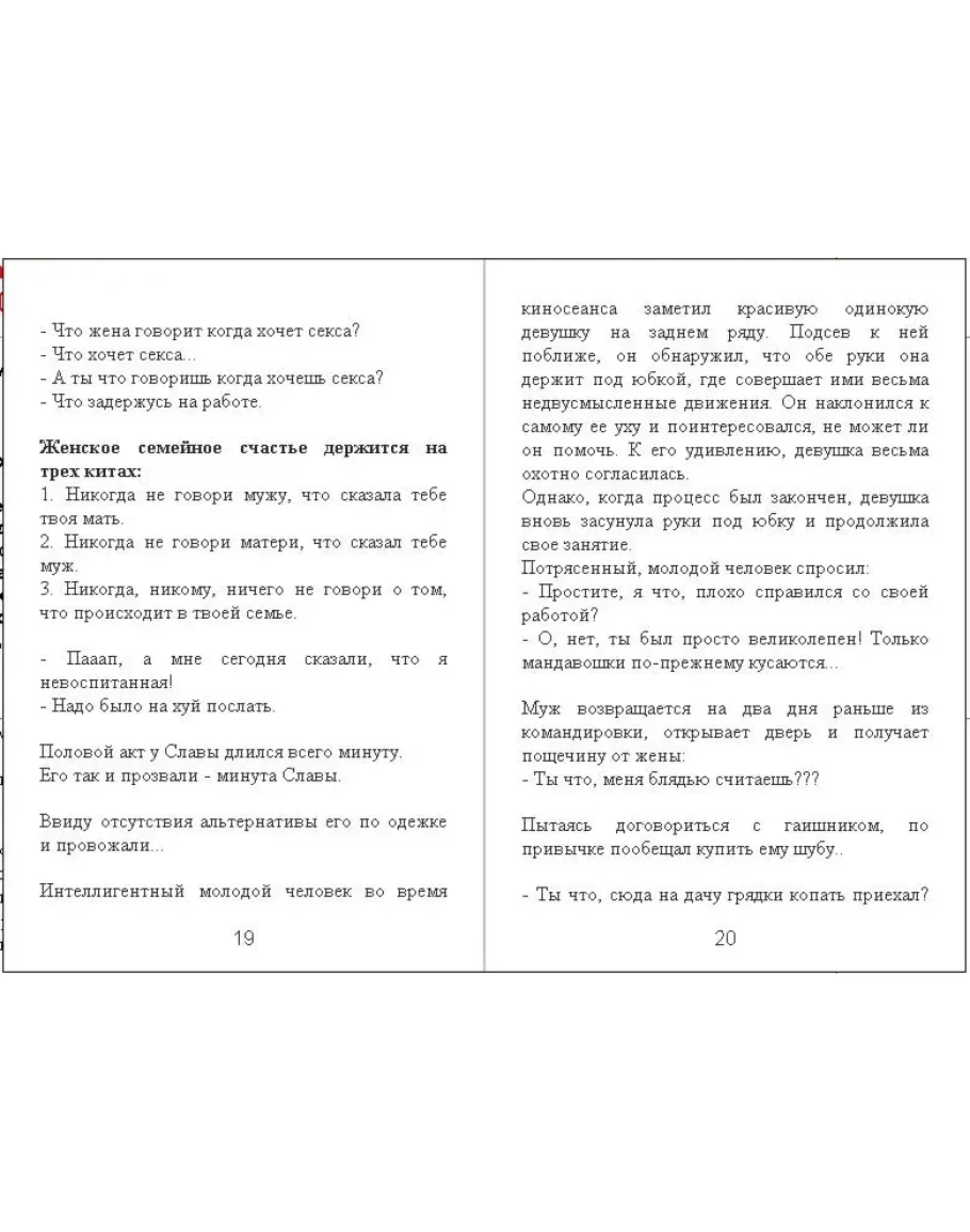 Сознательно не делал тематические выборки, так как считаю, что анекдоты должны идти одним потоком, а не ожидаемо, к примеру, только про тёщу на протяжении десяти страниц.