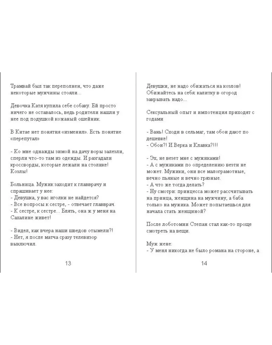 Сознательно не делал тематические выборки, так как считаю, что анекдоты должны идти одним потоком, а не ожидаемо, к примеру, только про тёщу на протяжении десяти страниц.