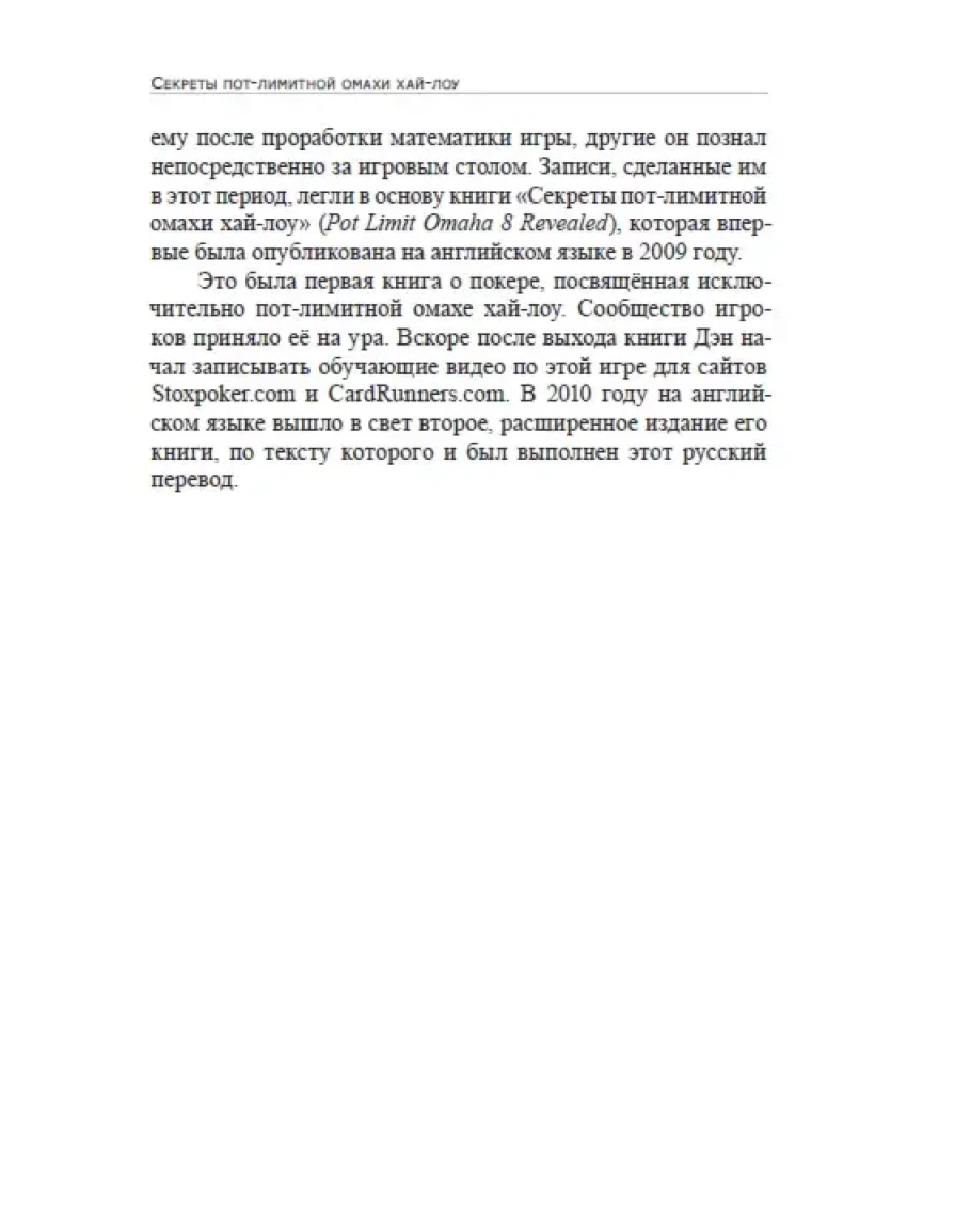 Книга Дэна Деппена – первая и единственная книга в мировой покерной литературе, раскрывающая секреты узкого круга профессиональных игроков в пот-лимитную омаху хай-лоу. Она научит вас выигрывать в эту игру. Если вы уже в неё выигрываете, то книга поможет вам овладеть новыми навыками и увеличить свои выигрыши.