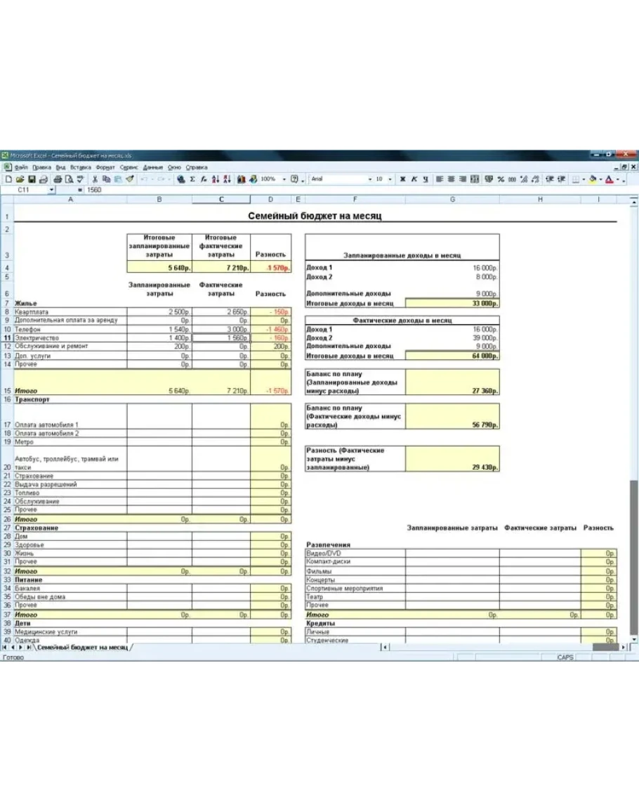 Как пользоваться: В начале месяца вы вносите приблизительные данные ожидаемых доходов и расходов по пунктам, названия которых там уже есть (наименований в таблице в избытке, некоторые пункты вы можете просто не заполнять, либо удалить, либо заменить какими-то своими). В течение месяца вносите в соответствующие ячейки фактические расходы. А в конце месяца смотрите разницу и делаете выводы. Очень удобно. Особенно наглядно видно по итогам месяца, где можно было воздержаться от трат, где сэкономить и т.д.