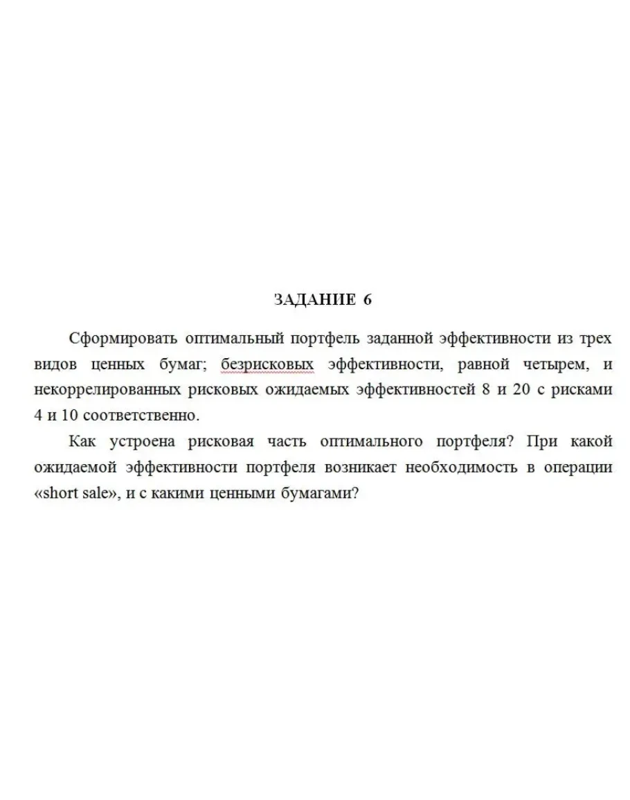 Сформировать оптимальный портфель заданной эффективности из трех видов ценных бумаг; безрисковых эффективности, равной четырем, и некоррелированных рисковых ожидаемых эффективностей 8 и 20 с рисками 4 и 10 соответственно.