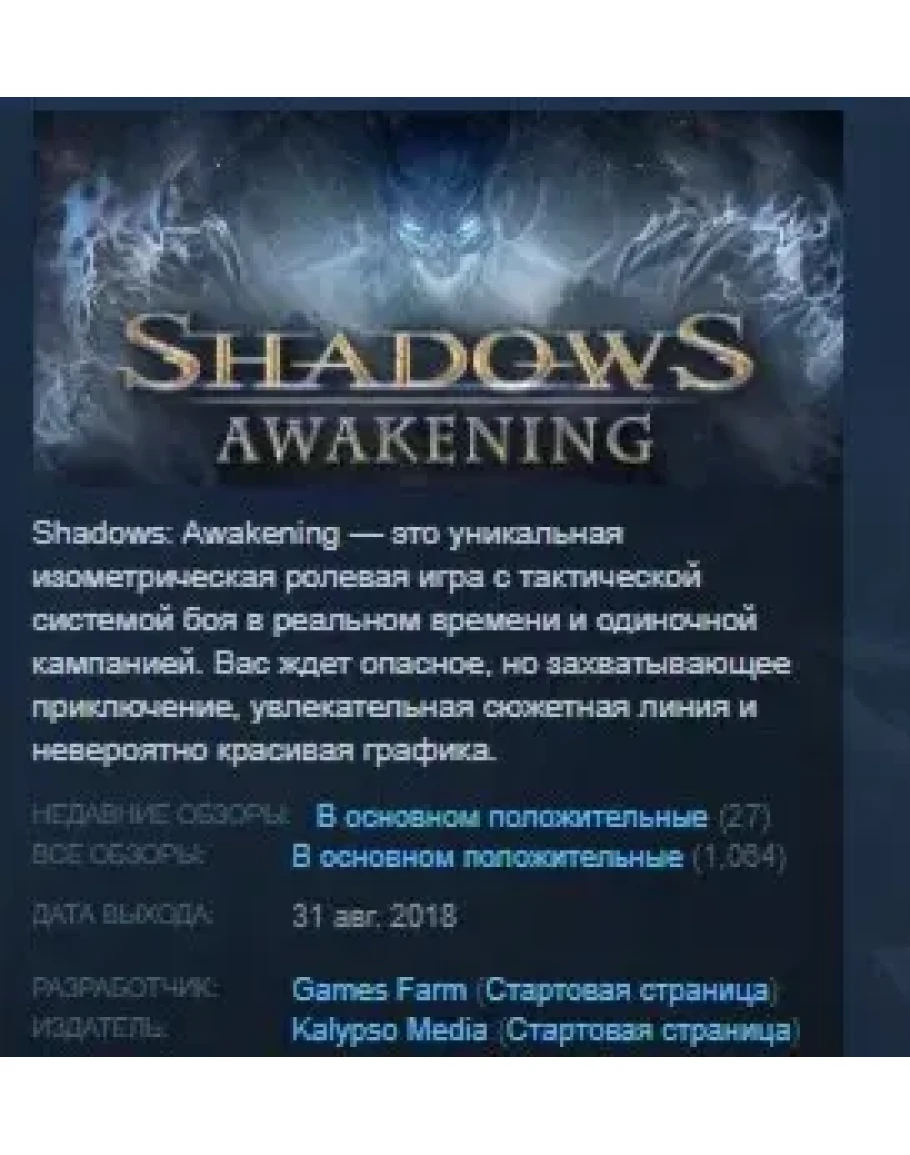 Shadows: Awakening — это уникальная изометрическая ролевая игра с тактической системой боя в реальном времени и одиночной кампанией. Вы играете за Пожирателя — демона, призванного из Мира теней, чтобы поглотить души давно погибших героев.Вас ждет опасное, но захватывающее приключение, увлекательная сюжетная линия и невероятно красивая графика. Достанет ли вам силы и мудрости, чтобы стать правителем таинственных Королевств ереси? Соберите собственный отряд из могущественных героев и используйте их уникальные навыки и способности — тогда в сражениях вам не будет равных. Но кто же здесь, все-таки, главный: демон или души, которые он поглотил? Вам предстоит сделать выбор: спасти мир, предотвратив серьезную угрозу, или же разрушить его до основания...