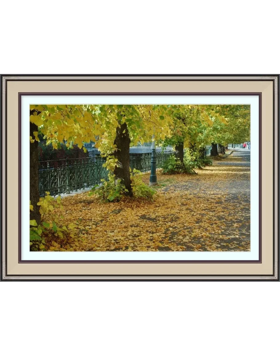 Надпись аллея в старой Праге. Залитая солнцем осенняя аллея в старой Праге