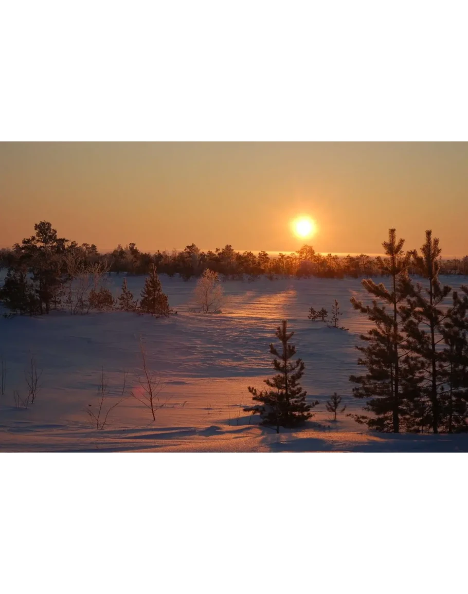 Надпись Закат солнца в диком зимнем лесу, фотография сделана в Уральском регионе