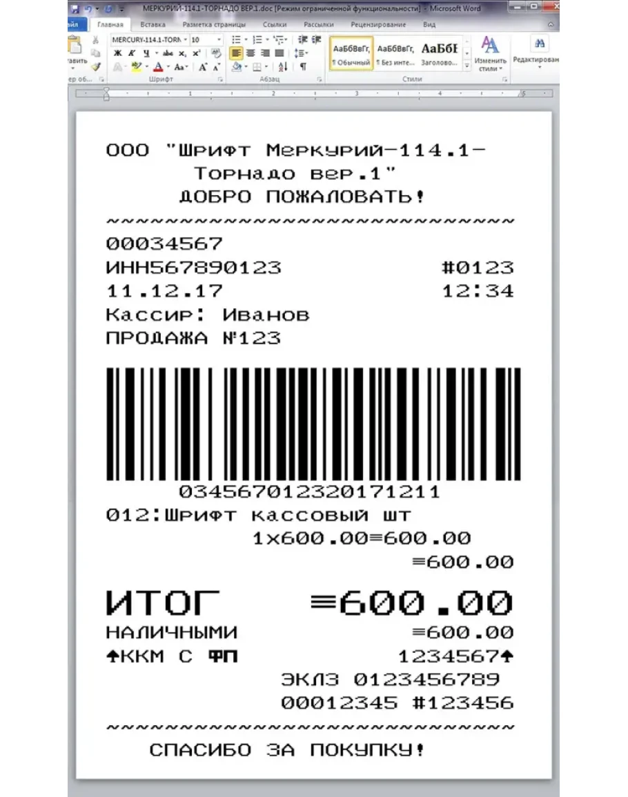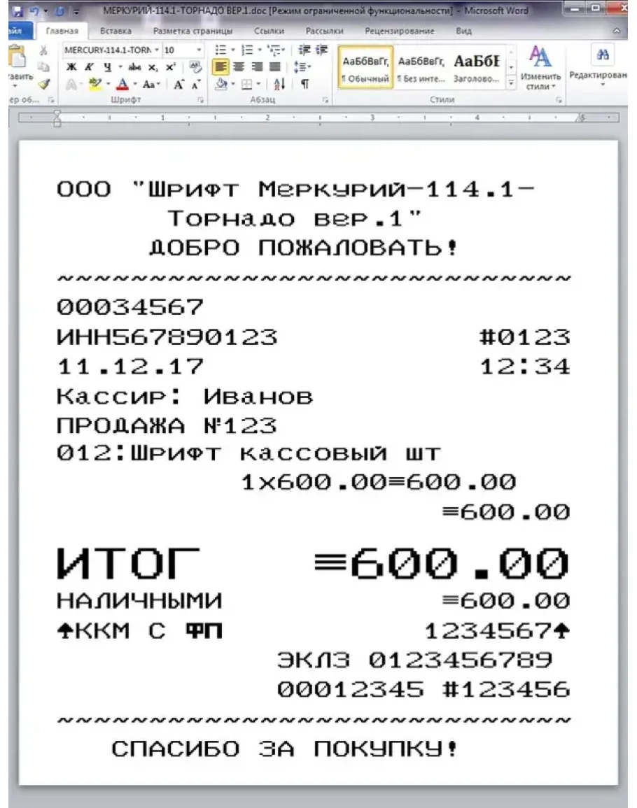 Шрифт кассового аппарата МЕРКУРИЙ-114.1-ТОРНАДО (Версия матрицы 16х10) в формате TTF (русские и английские буквы) для использования в программе Microsoft Word. В архиве находятся шрифт в формате TTF и шаблон чека. Вам остается только установить шрифт в систему (обычно C:\WINDOWS\Fonts), открыть шаблон и начать редактирование. Печатать чеки предпочтительно на термопринтере, на кассовой термоленте. Хотя можно печатать и на струйнике и лазерном, с возможностью вывода на факсовую бумагу. Лучшее качество, естественно, при печати на термопринтерах.