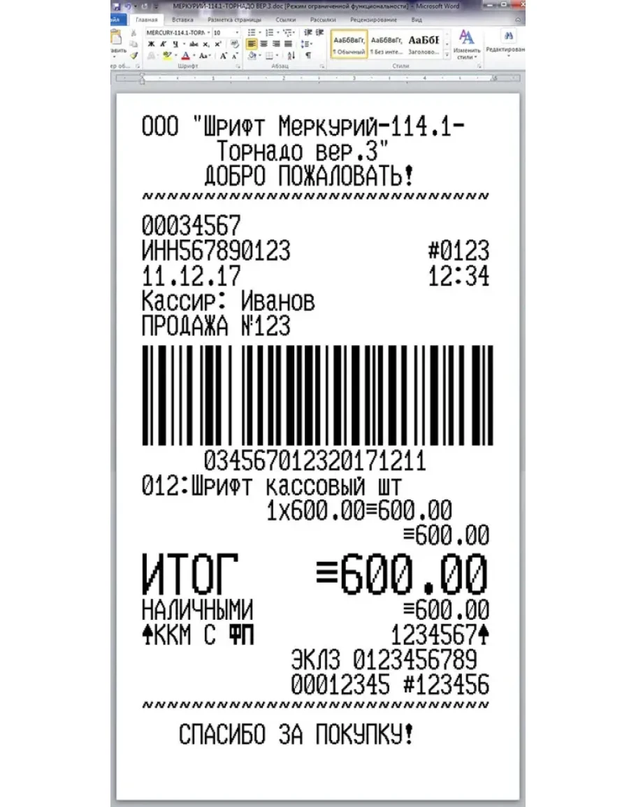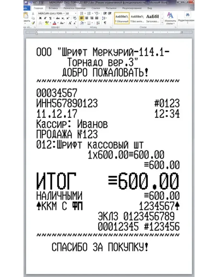 Шрифт кассового аппарата МЕРКУРИЙ-114.1-ТОРНАДО (Версия матрицы 16х20) в формате TTF (русские и английские буквы) для использования в программе Microsoft Word. В архиве находятся шрифт в формате TTF и шаблон чека. Вам остается только установить шрифт в систему (обычно C:\WINDOWS\Fonts), открыть шаблон и начать редактирование. Печатать чеки предпочтительно на термопринтере, на кассовой термоленте. Хотя можно печатать и на струйнике и лазерном, с возможностью вывода на факсовую бумагу. Лучшее качество, естественно, при печати на термопринтерах.