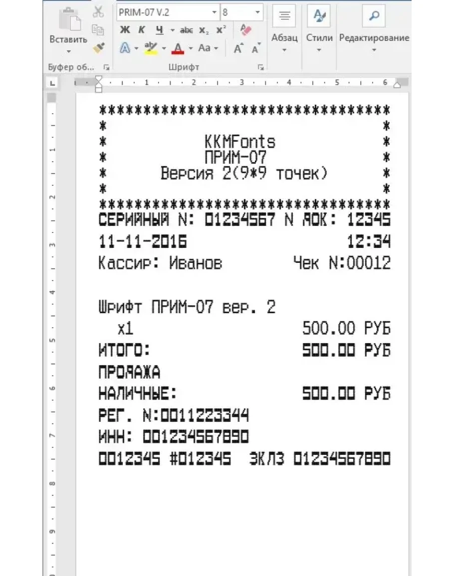 Шрифт кассового аппарата ПРИМ-07 версия 2(матрица 9х9) в формате TTF (русские и английские буквы) для использования в программе Microsoft Word. В архиве находятся стандартный и жирный шрифты в формате TTF и шаблон чека. Вам остается только установить шрифты в систему (обычно C:\WINDOWS\Fonts), открыть шаблон и начать редактирование.