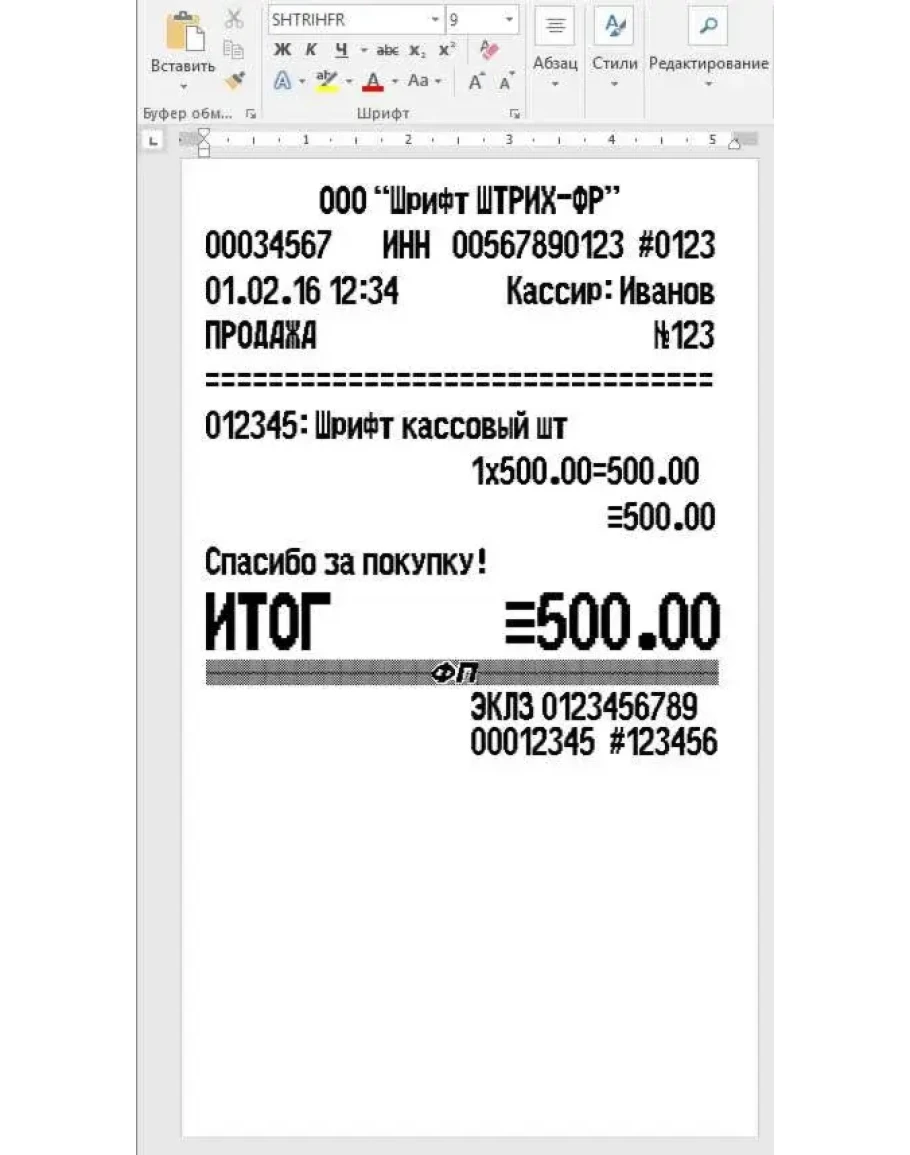 Шрифт кассового аппарата ШТРИХ-ФР в формате TTF (русские и английские буквы) для использования в программе Microsoft Word. В архиве находятся шрифт в формате TTF и шаблон чека. Вам остается только установить шрифт в систему (обычно C:\WINDOWS\Fonts), открыть шаблон и начать редактирование. Печатать чеки предпочтительно на термопринтере, как, например, CITIZEN-S310, на кассовой термоленте. Хотя можно печатать и на струйнике и лазерном, с возможностью вывода на факсовую бумагу. Лучшее качество, естественно, при печати на термопринтерах.