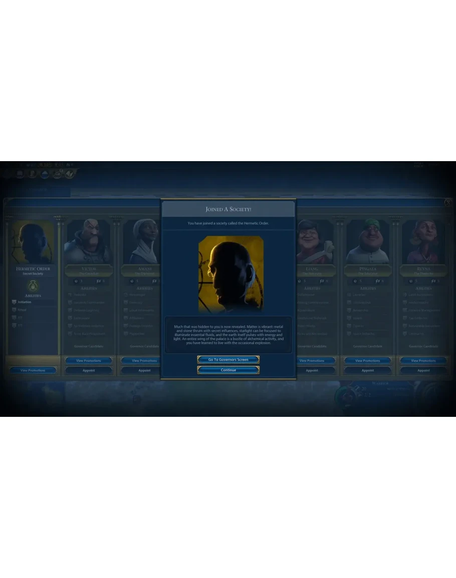 • Каждое тайное общество предлагает игрокам специального правителя, который применяет их бонусы ко всей цивилизации.
