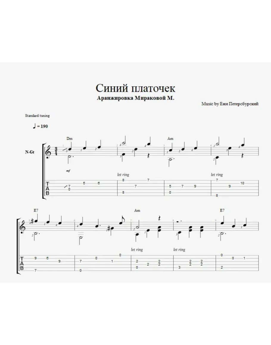 Переложение для шестиструнной гитары от Марины Мираковой на композицию Ежи Петерсбурского "Синий платочек".