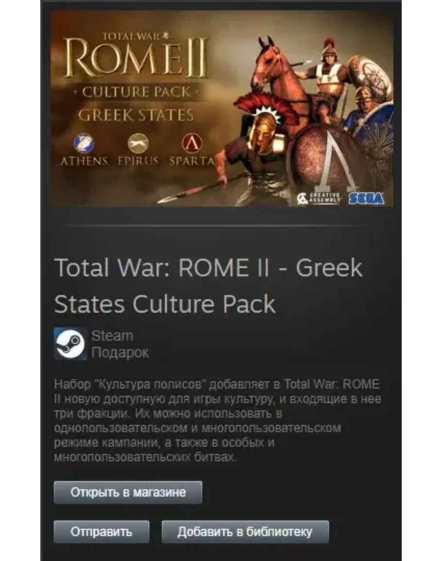Пакет «Total War: ROME II - Greek States Culture Pack» добавляет в Total War: ROME II новую игровую культуру, в том числе три новые игровые фракции; для использования в режимах одиночной или многопользовательской кампании, а также в пользовательских и многопользовательских сражениях. Пакет «Культура греческих государств» добавляет дипломатичные Афины, хитрый Эпир и грозную Спарту в качестве игровых фракций.