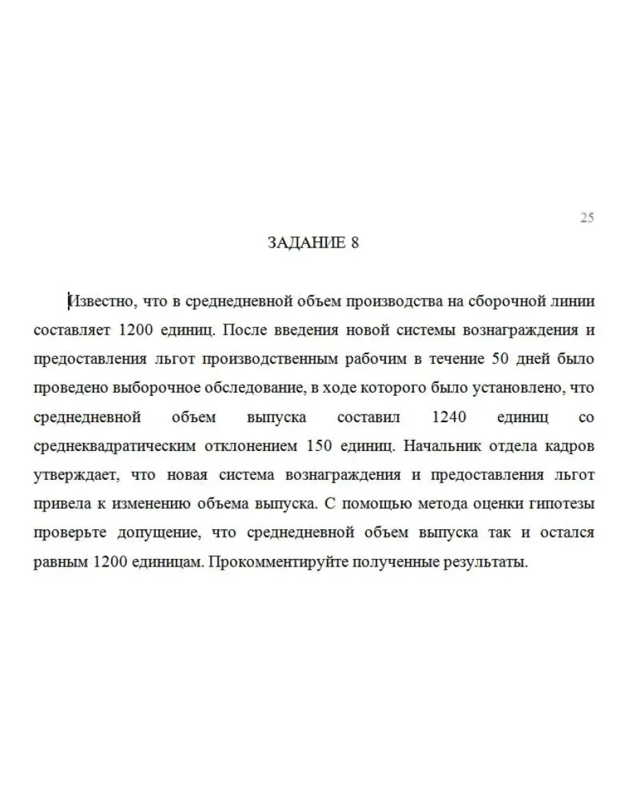 Известно, что в среднедневной объем производства на сборочной линии составляет 1200 единиц. После введения новой системы вознаграждения и предоставления льгот производственным рабочим в течение 50 дней было проведено выборочное обследование, в ходе которого было установлено, что среднедневной объем выпуска составил 1240 единиц со среднеквадратическим отклонением 150 единиц. Начальник отдела кадров утверждает, что новая система вознаграждения и предоставления льгот привела к изменению объема выпуска. С помощью метода оценки гипотезы проверьте допущение, что среднедневной объем выпуска так и остался равным 1200 единицам. Прокомментируйте полученные результаты.