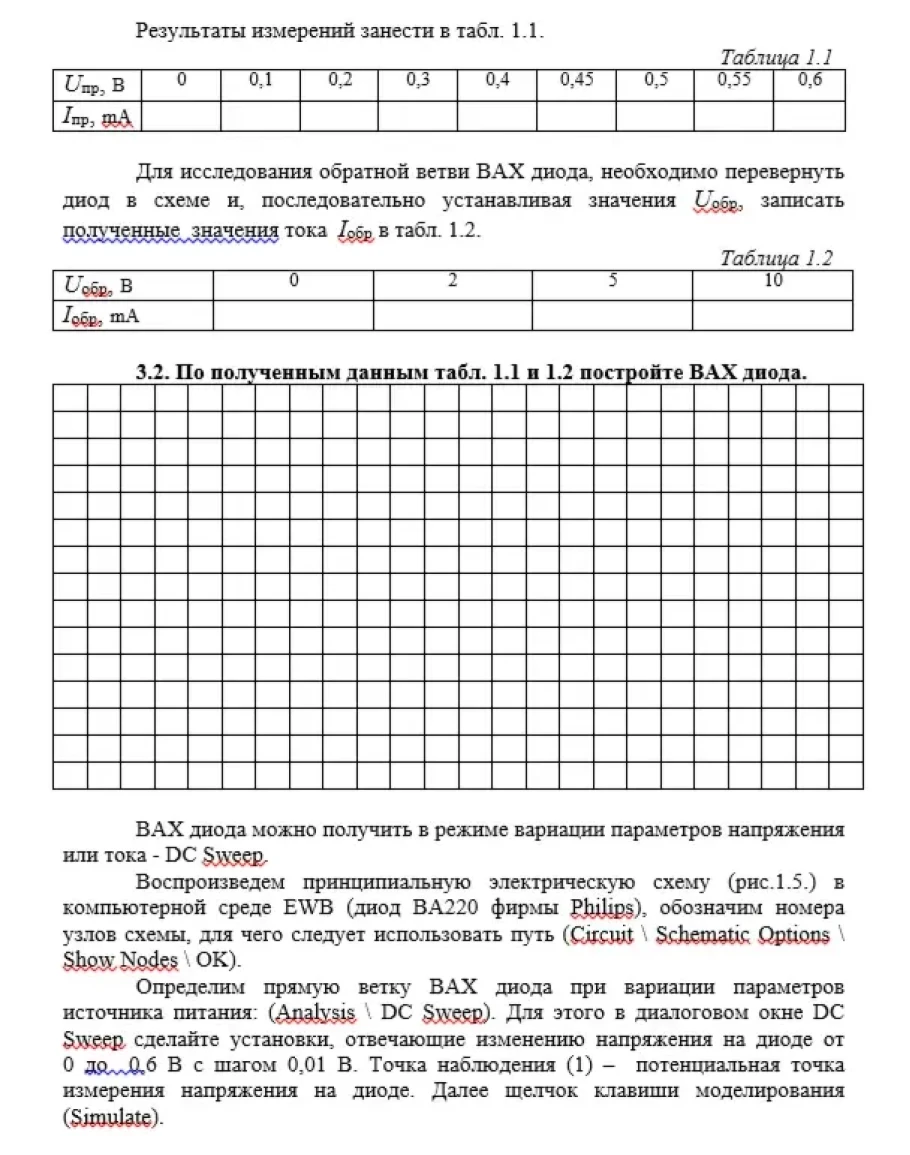 7. Изменять прямое напряжение диода в пределах, указанных в табл. 1.1, фиксируя значения тока через каждые (0,1 … 0,05) В.
