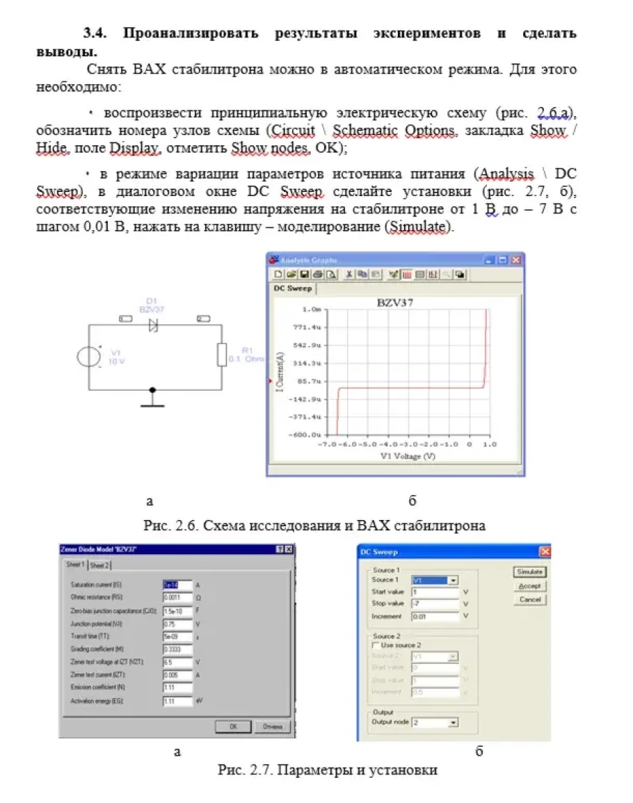 Воспроизвести принципиальную электрическую схему (рис. 2.4) в компьютерной среде EWB, установить тип стабилитрона BZV37. Потенциометром R1 изменять обратное напряжение на стабилитроне в пределах, указанных в табл. 2.1. При появлении явления пробоя можно увеличить число фиксируемых точек характеристики. Для каждого значения напряжения измерять ток и заносить в табл. 2.1.