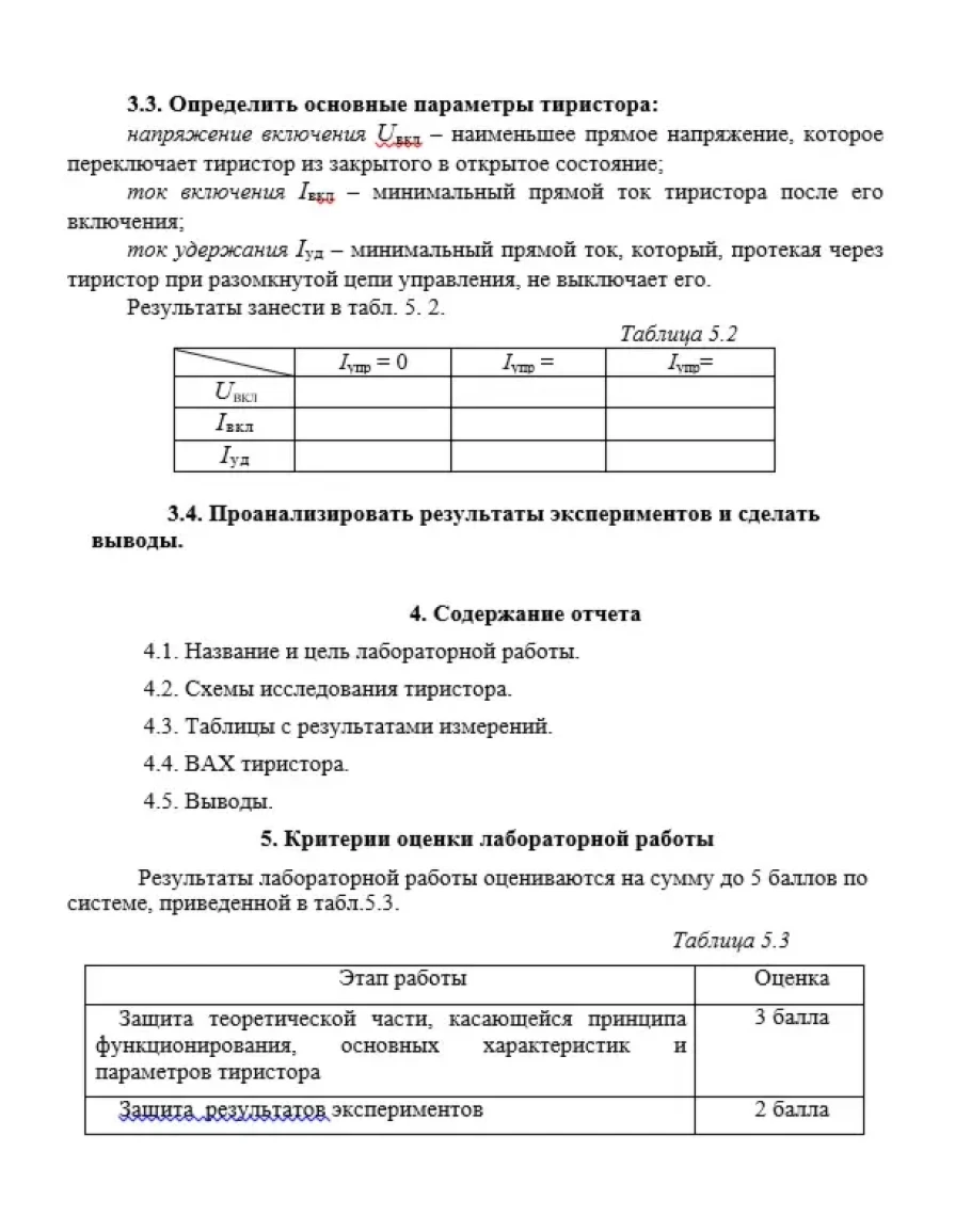 ٠ снять зависимость тока анода тиристора І = f(U) для трех значений тока управления, начиная с Iупр = 0.