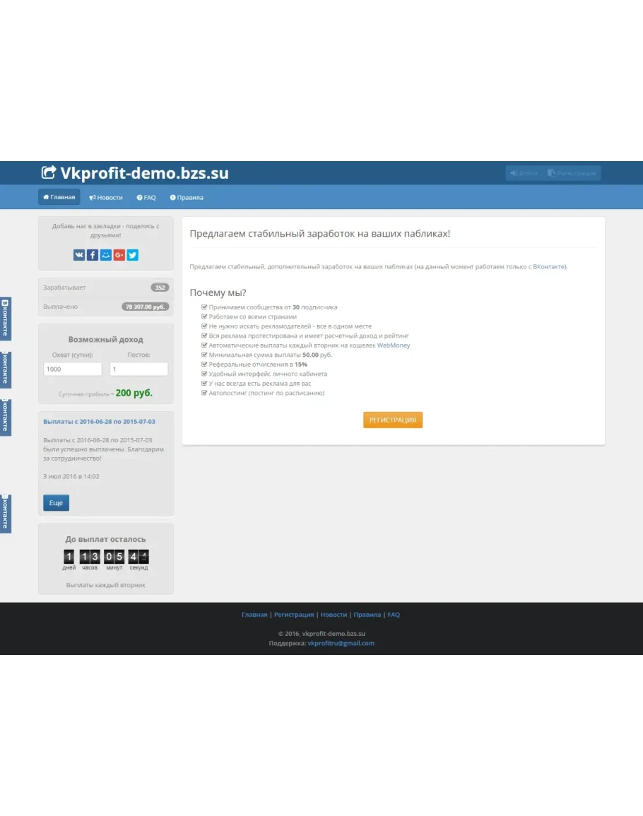 Скрипт Vkprofit разработан для заработка на офферах СPA партнерок, которые предоставляют функцию POST-BACK, методом постинга в паблики Вконтакте администраторами за лид из которого начисляется ему вознаграждение - ну а процент (выставляемый в админке скрипта) ваш.