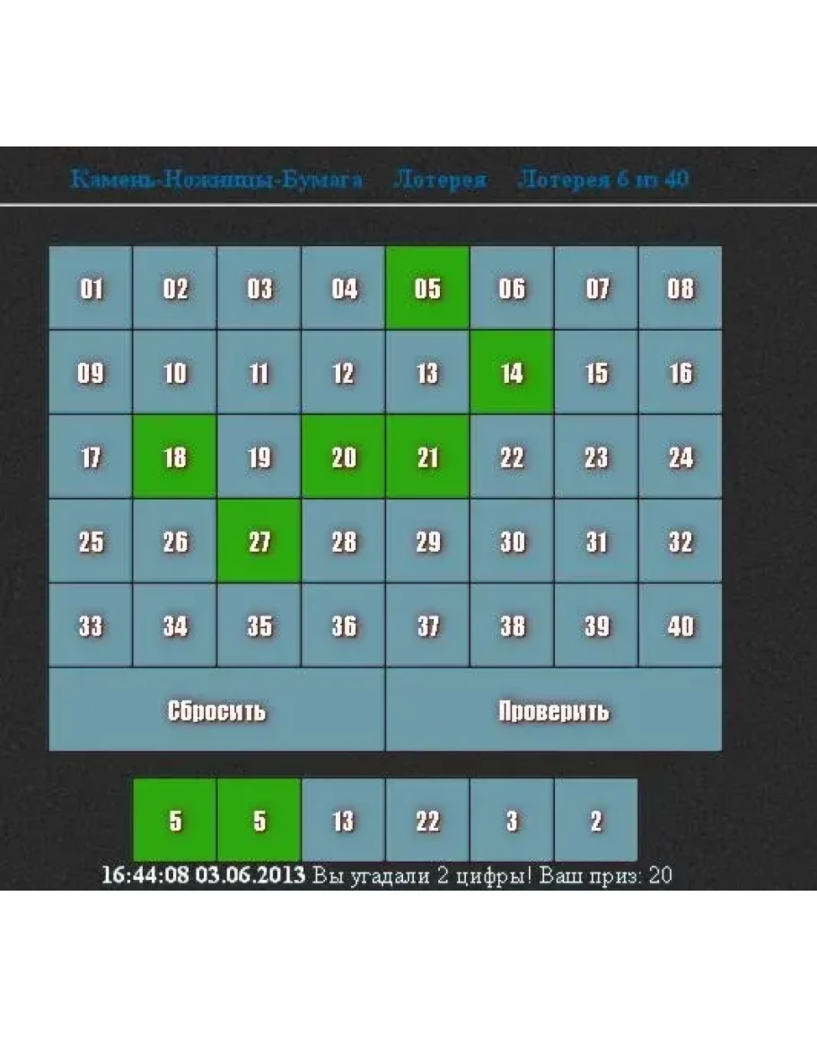 Описание: Простая лотерея, пользователь выбирает 6 чисел из 40 представленных, нажимает кнопку "Проверить" и получает результат.