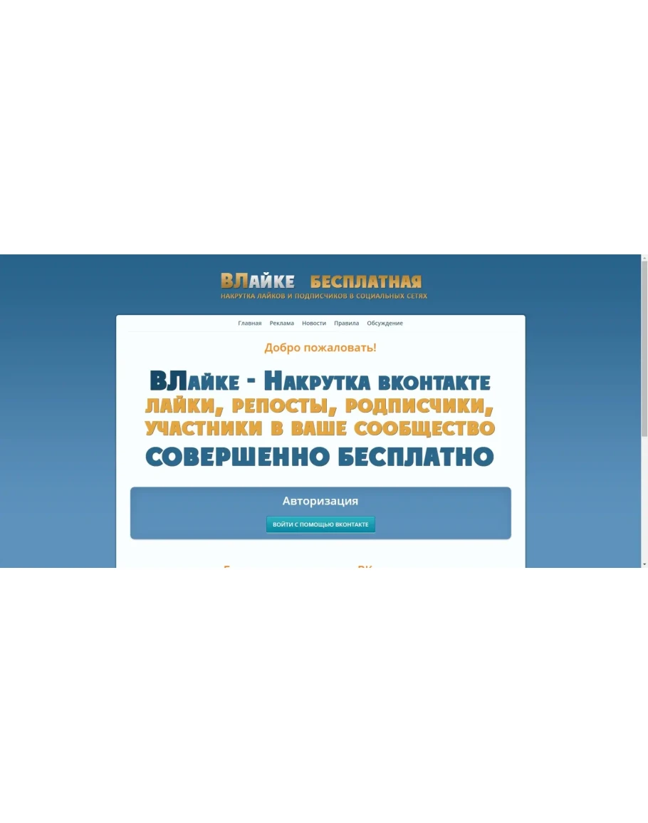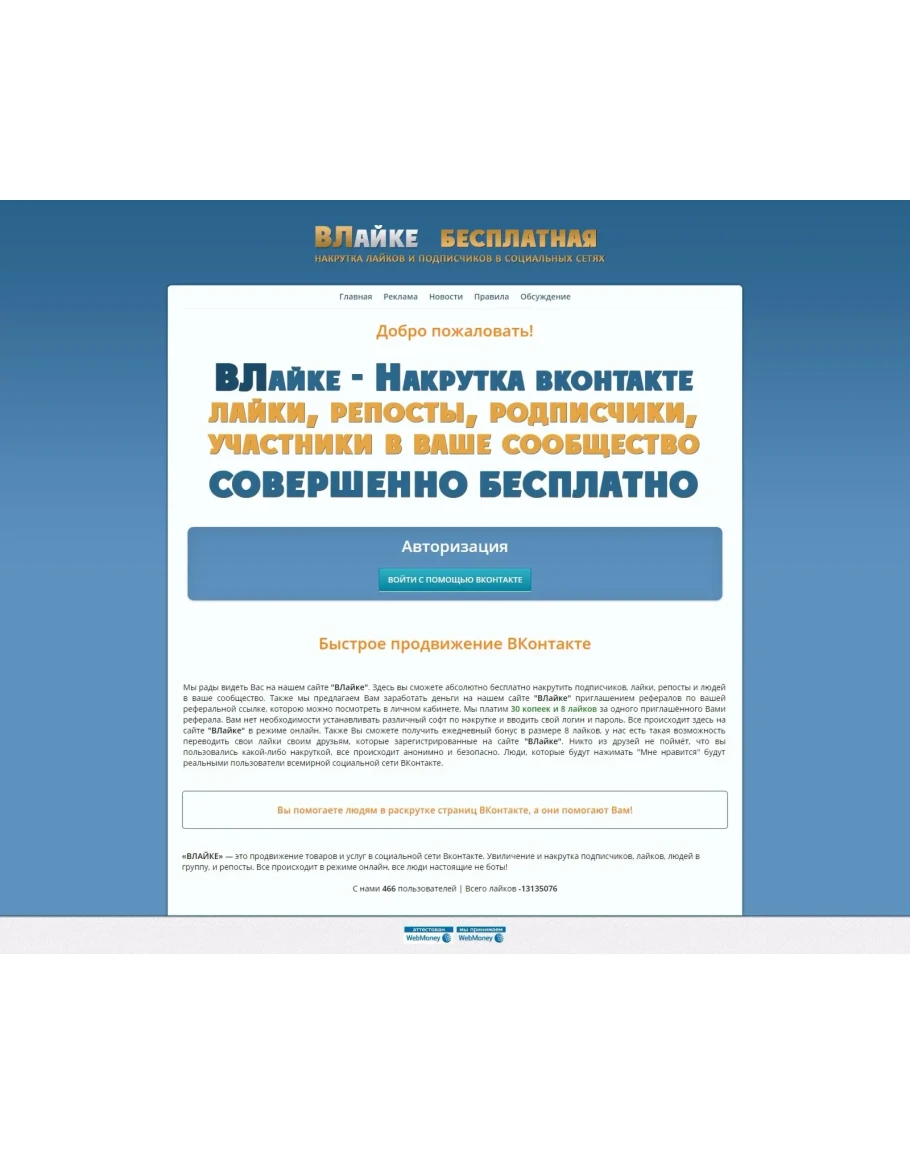ВЛАЙКЕ - скрипт для бесплатной накрутки подписчиков, лайков, людей в группу, и репостов в социальной сети VKontakte. Скрипт работает в режиме онлайн, т.е. пользователям не нужно устанавливать дополнительный софт. Присутствует реферальная система и ежедневный бонус. Есть возможность передачи лайков другим пользователям ресурса.