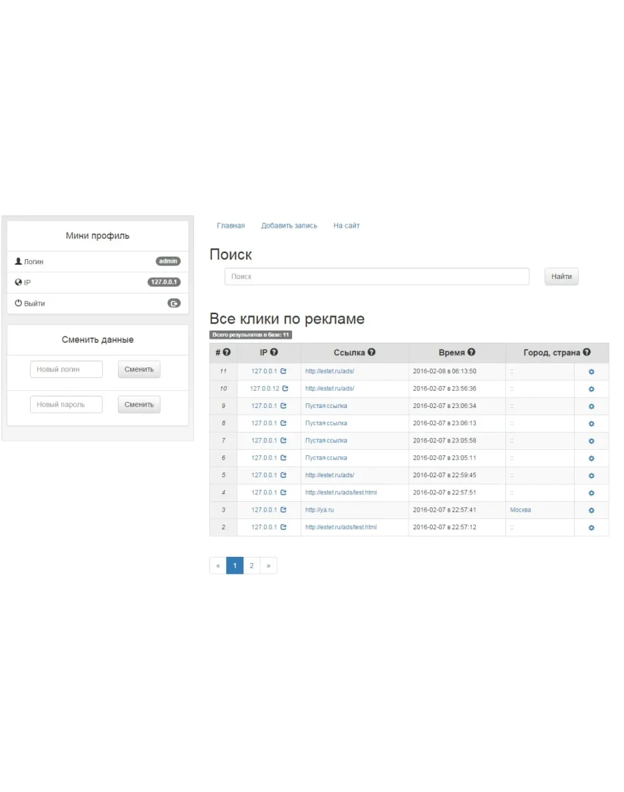 Возможность удалять, добавлять запись о нажатии, добавлять комментарий к клику, и изменить его данные (в том числе IP, ссылку, страну)
