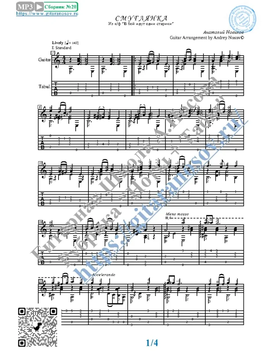Кликните "Подробнее" для получения дополнительной информацииВашему вниманию предлагается песня "Смуглянка" (А.Новиков), из к/ф "В бой идут одни старики", предназначенная для исполнения на 6-ти струнной гитаре СОЛО. Запись выполнена нотами, сопровождена подробнейшей аппликатурой и продублирована табулатурой. И ещё…