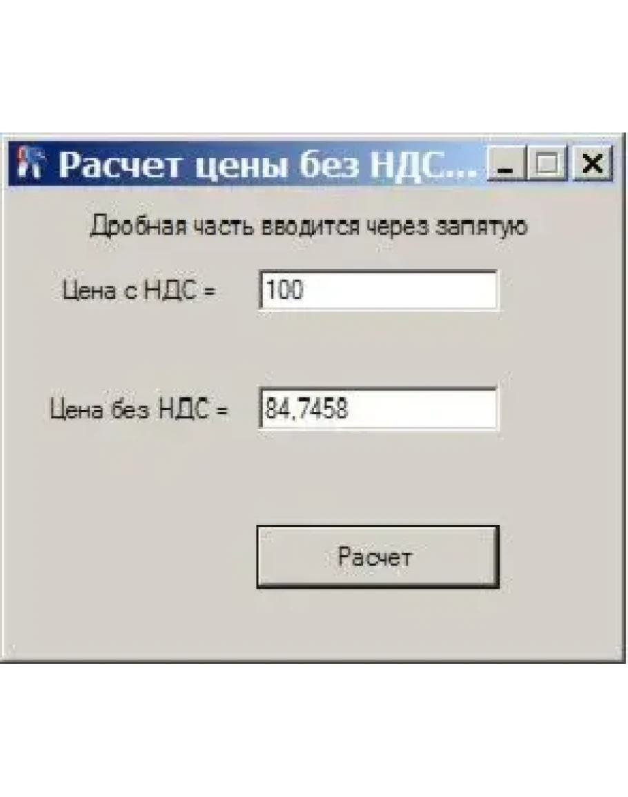 В архиве программа по переводу цены с НДС 18% на цену без НДС. Всё просто, вводите цену с НДС,жмёте расчет и программа рассчитывает и показывает цену без НДС. Удобно для снабженцев,бухгалтеров и т.д.