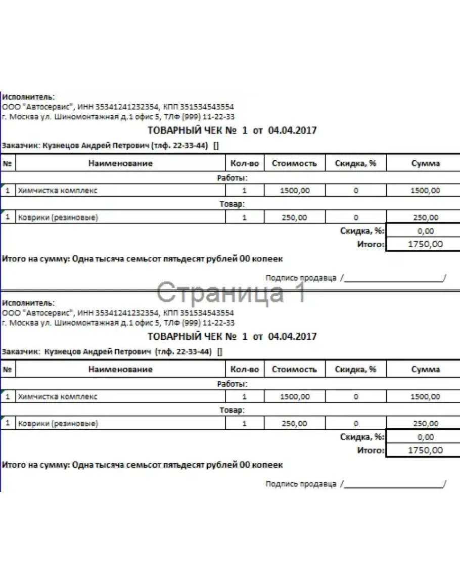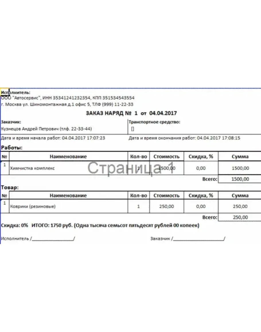 - Распечатывать выходные формы: Заказ-наряд, Товарный чек.