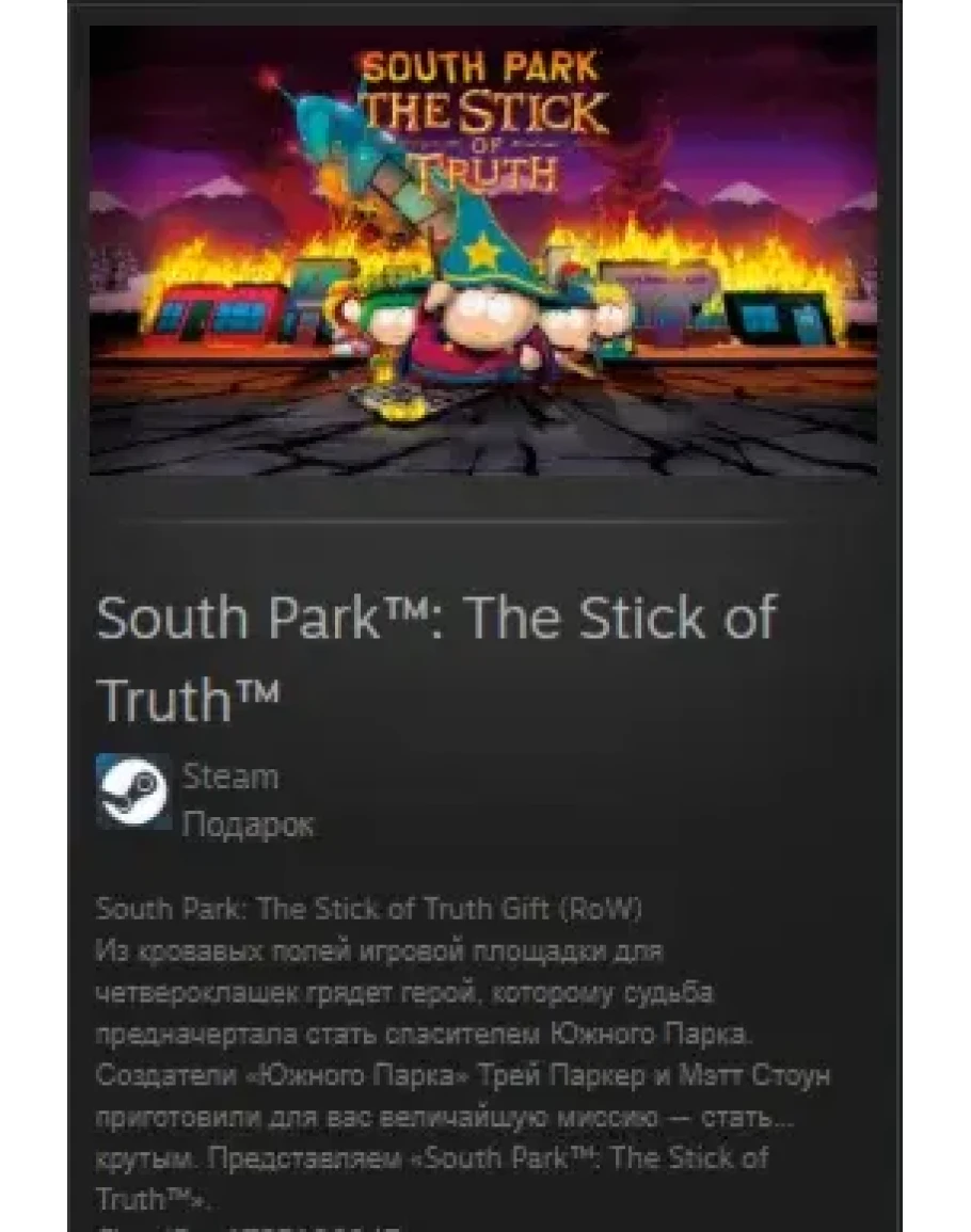 Из кровавых полей игровой площадки для четвероклашек грядет герой, которому судьба предначертала стать спасителем Южного Парка. Создатели «Южного Парка» Трей Паркер и Мэтт Стоун приготовили для вас величайшую миссию — стать… крутым. Представляем «South Park™: The Stick of Truth™».