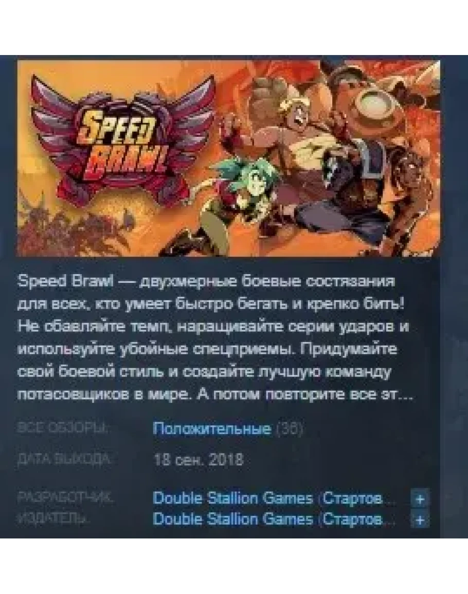Speed Brawl — двухмерные боевые состязания для всех, кто умеет быстро бегать и крепко бить! Не сбавляйте темп, наращивайте серии ударов и используйте убойные спецприемы. Придумайте свой боевой стиль и создайте лучшую команду потасовщиков в мире. А потом повторите все это быстрее… быстрее… ЕЩЕ БЫСТРЕЕ!