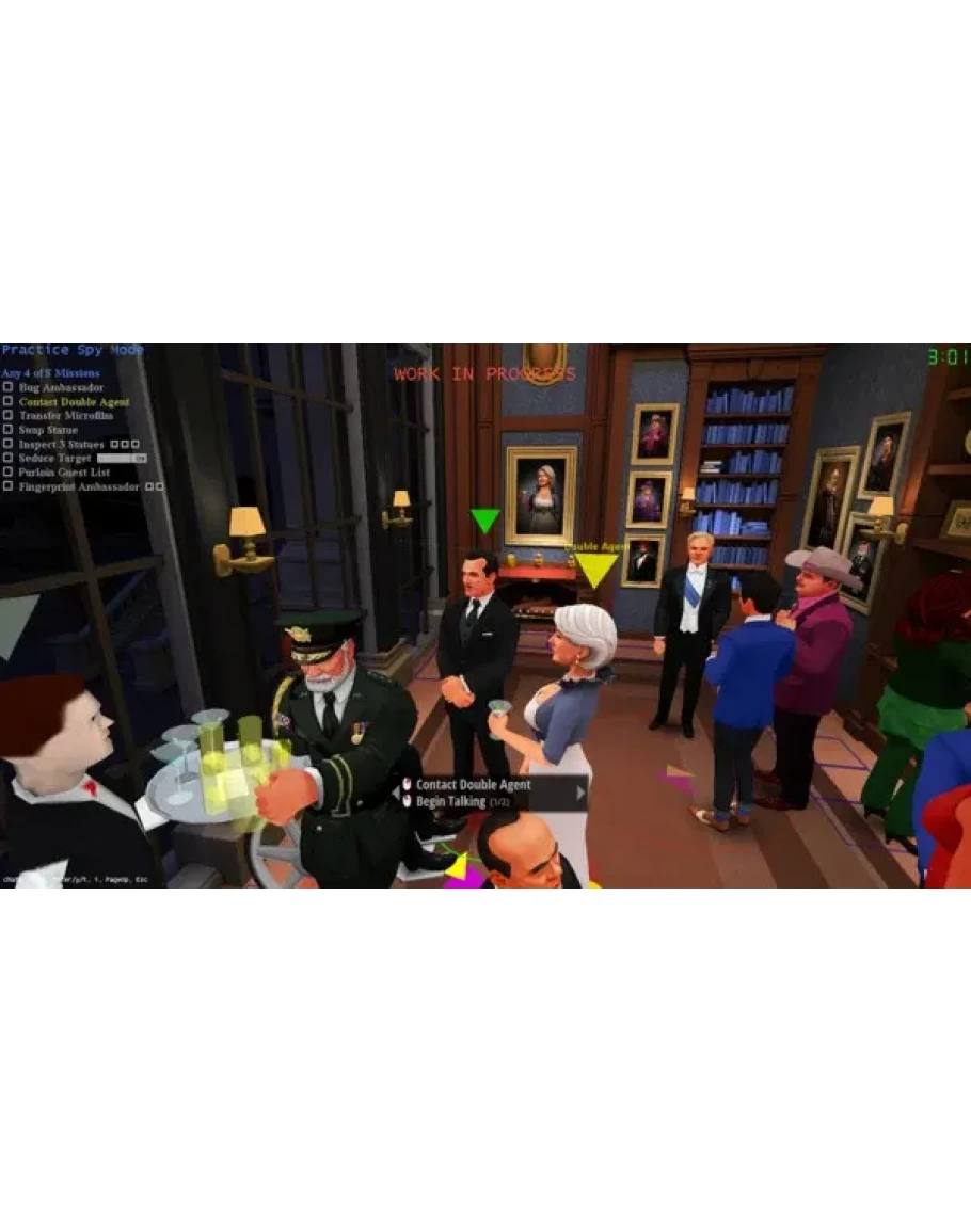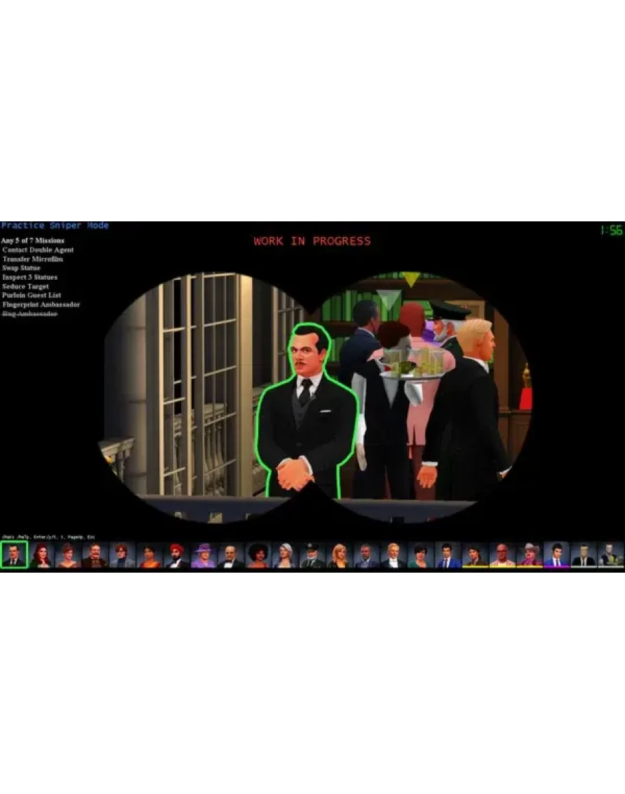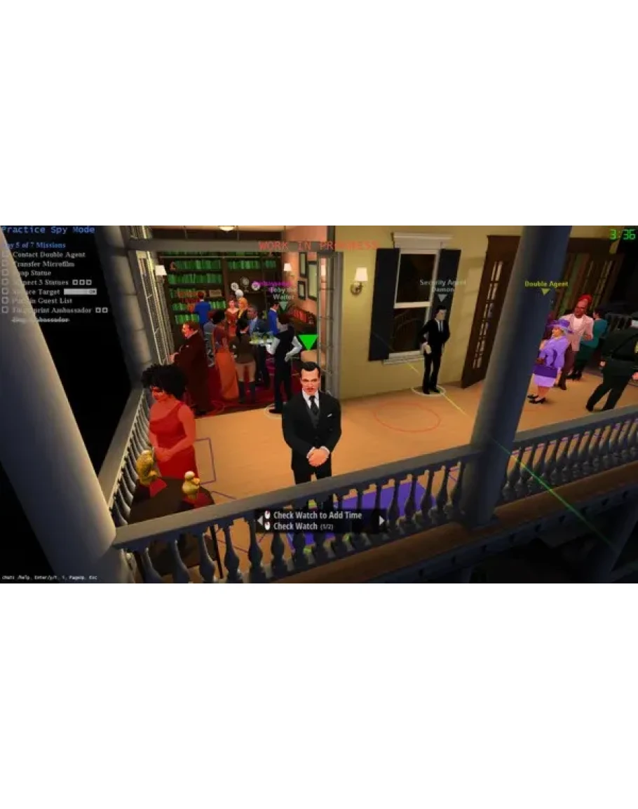 SpyParty is a competitive espionage game about subtle human behavior. A Spy hides in plain sight at a fancy cocktail party, trying to accomplish missions while blending in with the other guests, while a Sniper with a single bullet looks inward, searching for the Spy.