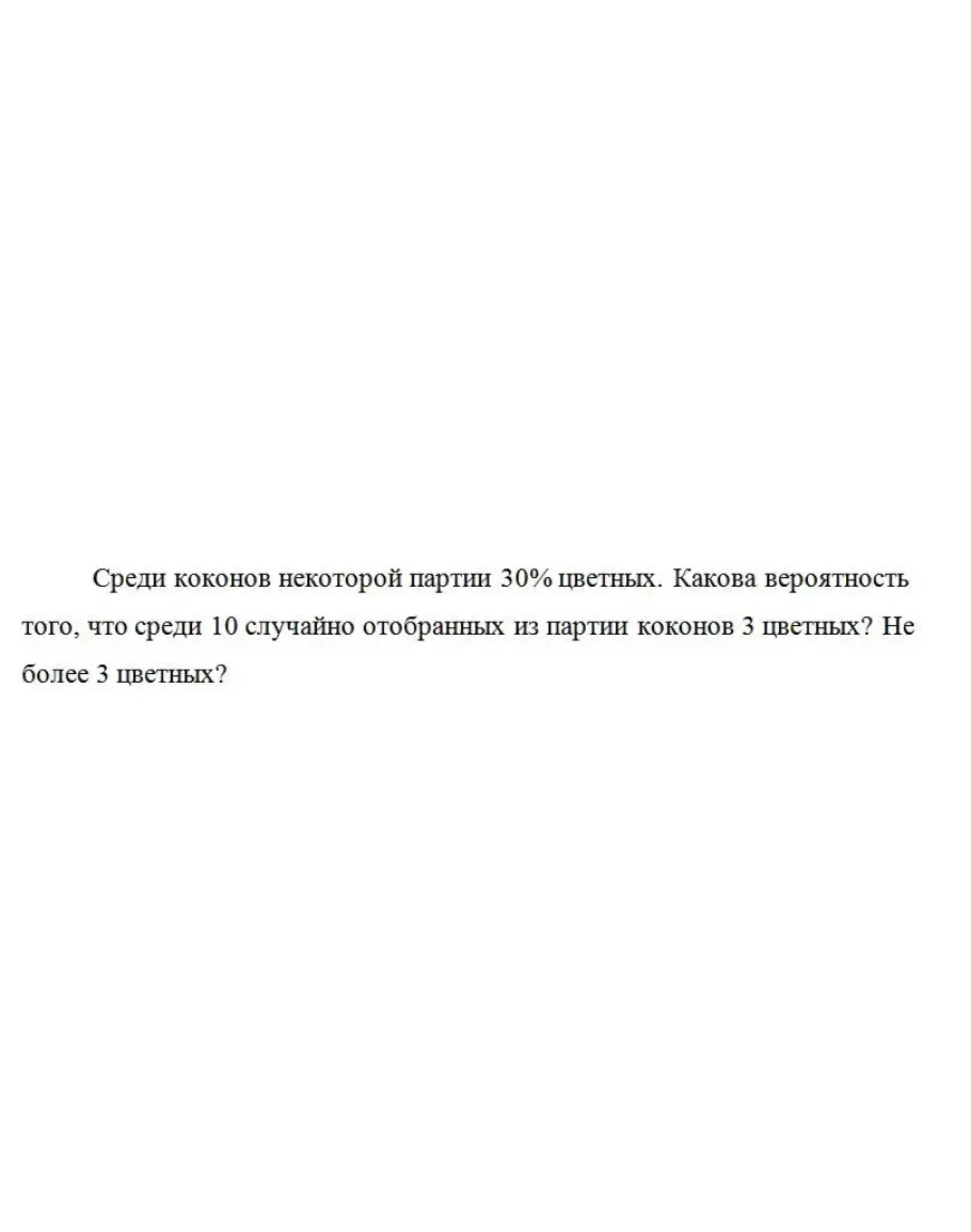 Среди коконов некоторой партии 30% цветных. Какова вероятность того, что среди 10 случайно отобранных из партии коконов 3 цветных? Не более 3 цветных?