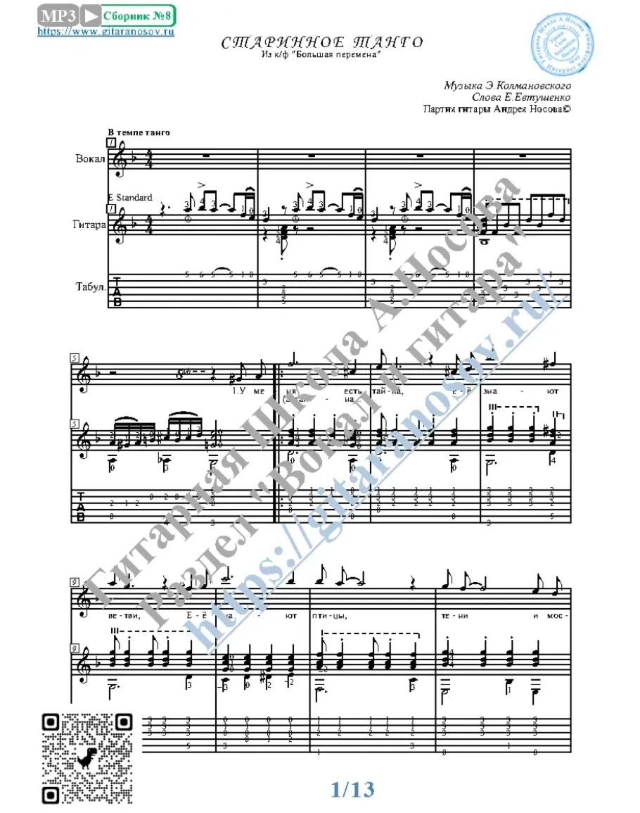 Кликните "Подробнее" для получения дополнительной информацииВашему вниманию предлагается композиция "Старинное танго (муз.Э.Колмановского, сл.Е.Евтушенко)", предназначенная для вокала в сопровождении 6-ти струнной гитары. Запись выполнена нотами и включает в себя партию вокала с подтекстовкой, партию гитары с подробнейшей аппликатурой и текст песни (НА РУССКОМ).