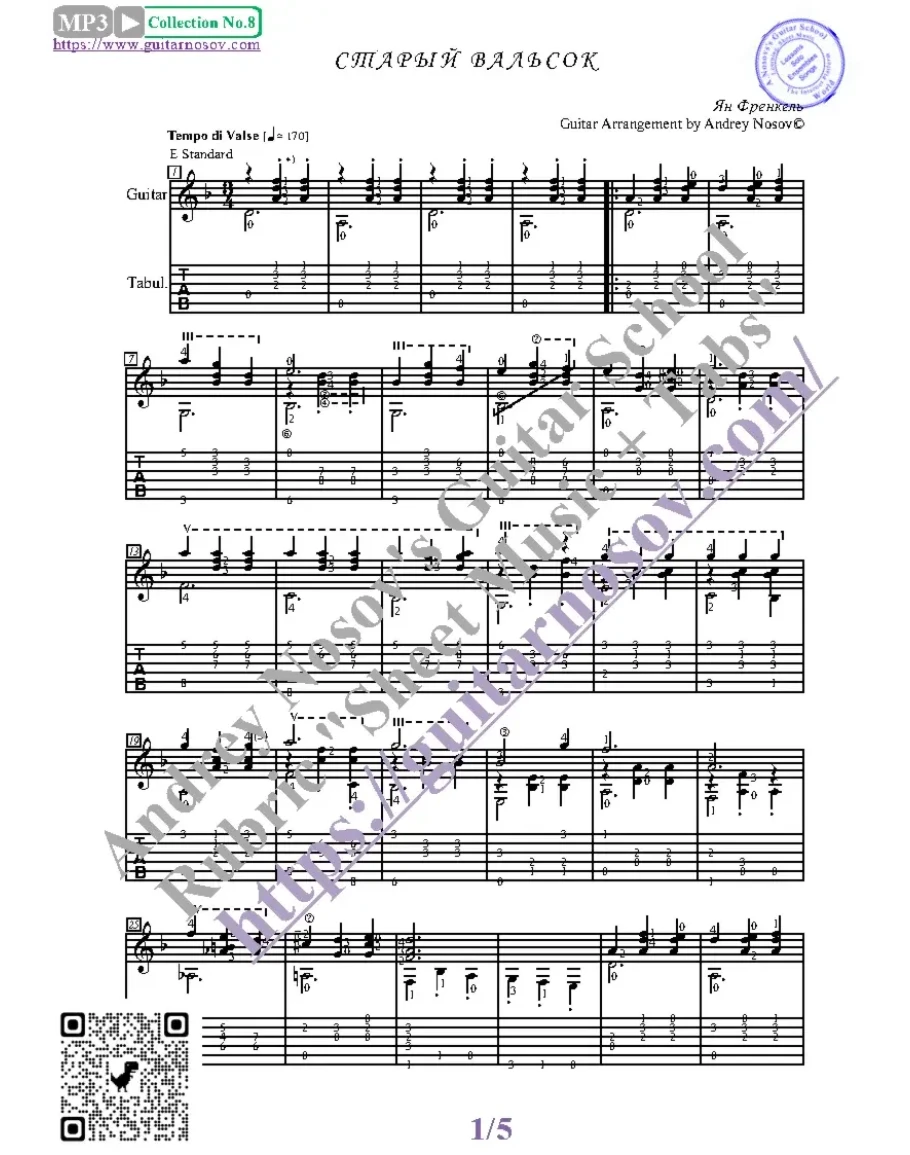 Кликните "Подробнее" для получения дополнительной информацииВашему вниманию предлагается композиция "Старый вальсок (Я.Френкель)", предназначенная для исполнения на 6-ти струнной гитаре СОЛО. Запись выполнена нотами, сопровождена подробнейшей аппликатурой и продублирована табулатурой.