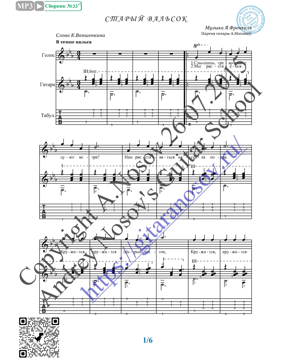 Кликните "Подробнее" для получения дополнительной информацииВашему вниманию предлагается композиция "Старый вальсок (муз.Я.Френкеля, сл.К.Ваншенкина)", предназначенная для вокала в сопровождении 6-ти струнной гитары (pdf / png*). Запись выполнена нотами и включает в себя партию вокала с подтекстовкой, партию гитары с подробнейшей аппликатурой, текст песни (НА РУССКОМ ЯЗЫКЕ). Партия гитары продублирована табулатурой. Прилагается ссылка на скачивание mp3.
