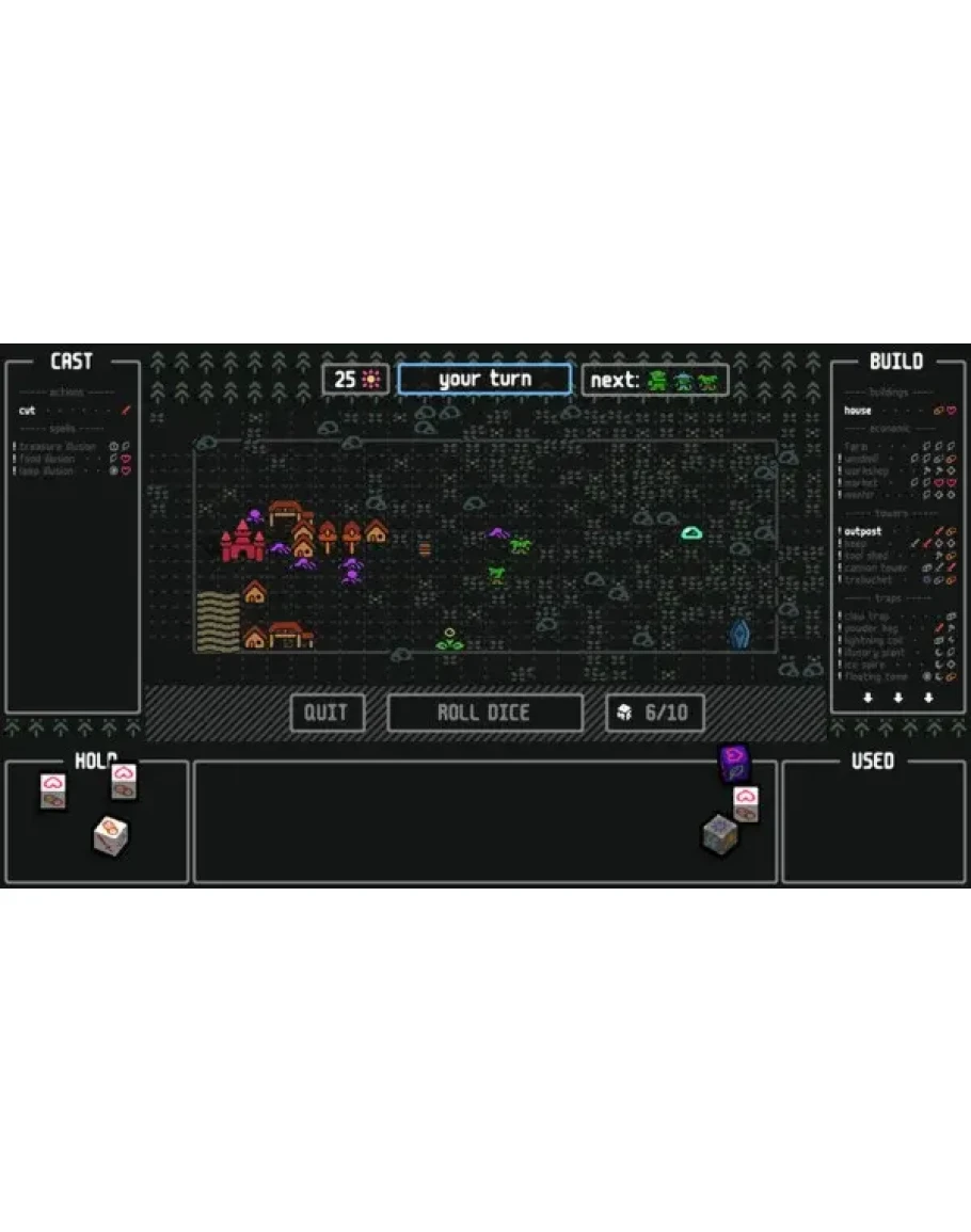Luckitown is a turn-based tower defense where you roll dice to build new structures and cast spells to defend your town.