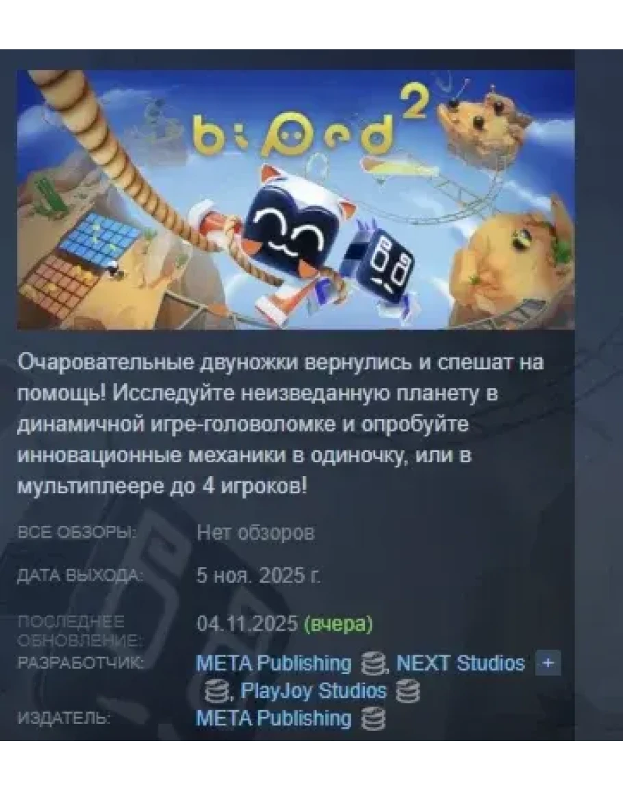 Очаровательные двуножки вернулись и спешат на помощь! Исследуйте неизведанную планету в динамичной игре-головоломке и опробуйте инновационные механики в одиночку, или в мультиплеере до 4 игроков!