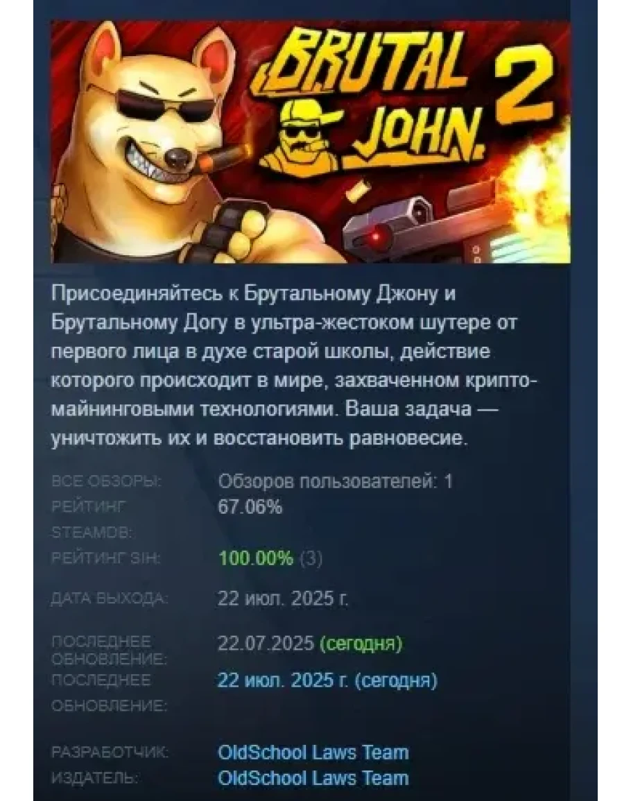 Присоединяйтесь к Брутальному Джону и Брутальному Догу в ультра-жестоком шутере от первого лица в духе старой школы, действие которого происходит в мире, захваченном крипто-майнинговыми технологиями. Ваша задача — уничтожить их и восстановить равновесие.