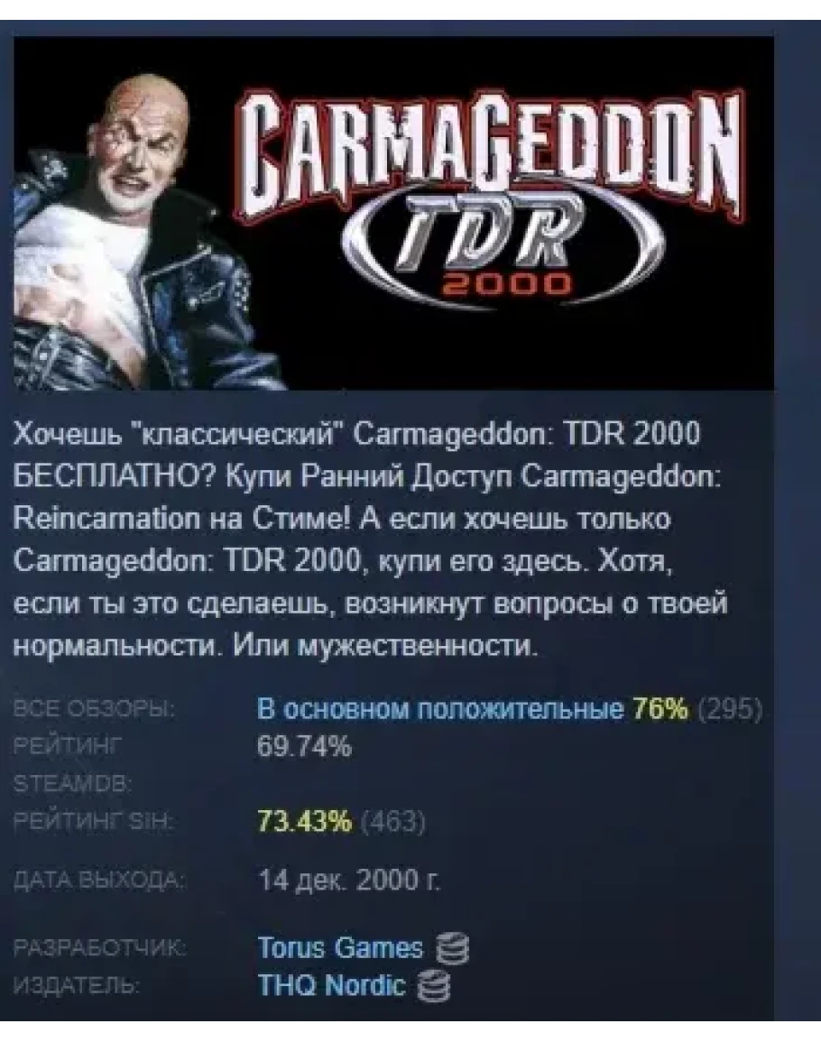 Хочешь "классический" Carmageddon: TDR 2000 БЕСПЛАТНО? Купи Ранний Доступ Carmageddon: Reincarnation на Стиме! А если хочешь только Carmageddon: TDR 2000, купи его здесь. Хотя, если ты это сделаешь, возникнут вопросы о твоей нормальности. Или мужественности.